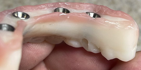 Several factors increasing the risk of peri-implantitis have been reported. Lack of access to the intaglio surface of the implant-supported prosthetics and poor oral hygiene of the implant is reported to increase the risk of peri-implantitis (Figure 3 through Figure 5). Concave intaglio design prevents oral hygiene access (Figure 6). Monje reported that 77.2% of the peri-implantitis cases had inadequate access for cleansability. 9 Serino and Ström found that 74% of the implants had no access to proper plaque control and highlighted the role of prosthesis design.10 Katafuchi suggested that a shallow emergence angle (EA) with a straight or concave transmucosal profile at the interproximal sites should be considered to minimize peri-implantitis risk for bone-level implant.11