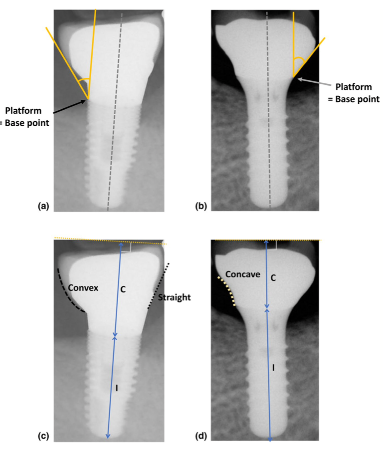 Yi identified influence of prosthetic features that increase and decrease the risk of peri-implantitis through comprehensive analysis.19 There is a positive correlation between the amount of marginal bone loss (MBL), the emergence angle (EA), and convex Eps, and the risk of peri- implantitis (Figure 7). The risk is significantly raised with the increase in the EA (>30 degrees) and the prevalence of peri-implantitis in the convex group. In addition, splinting adjacent implant-supported restorations was identified be a significant risk indicator, particularly position of implants whether, splinted-mesial; middle; or distal) (Figure 8). Yi reported the influence of the EA and the EP on the MBL in the bone-level group for both external and internal connection types, but not the case for the tissue-level group.19 The high prevalence of peri-implantitis in the splinted-middle group may be explained by the limited accessibility for oral hygiene. When adequate cleansability is possible through proper access, the risk of the splinted-middle group to develop peri-implantitis should decrease.