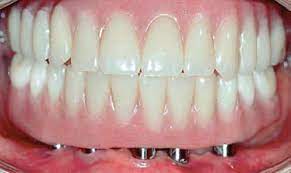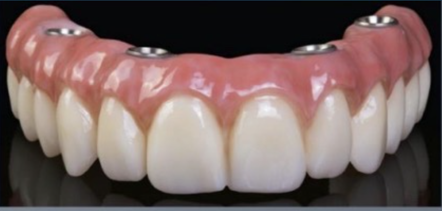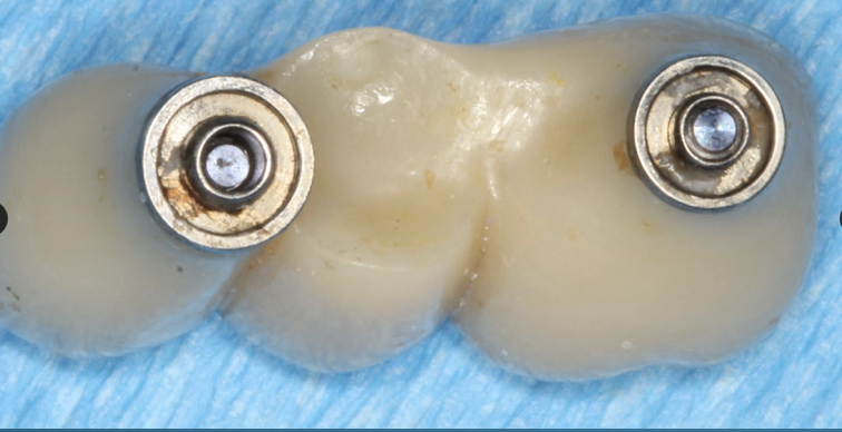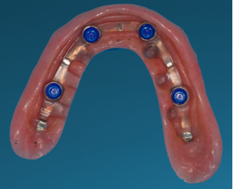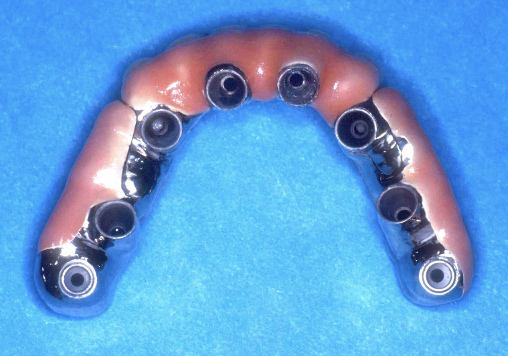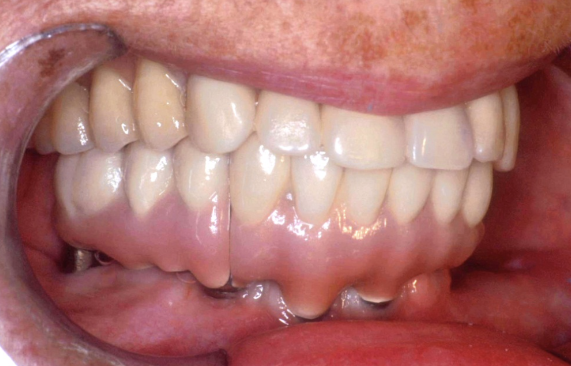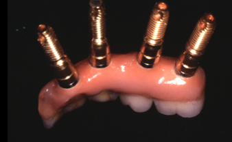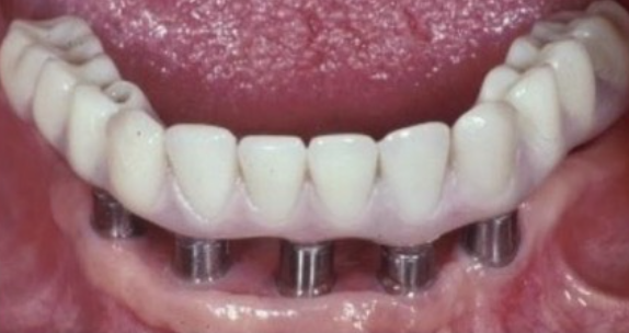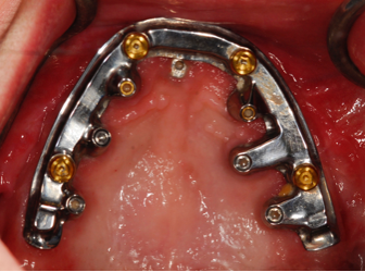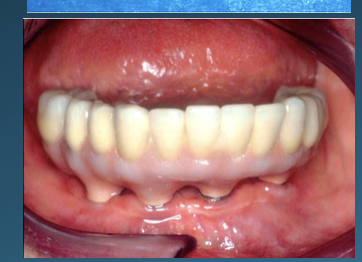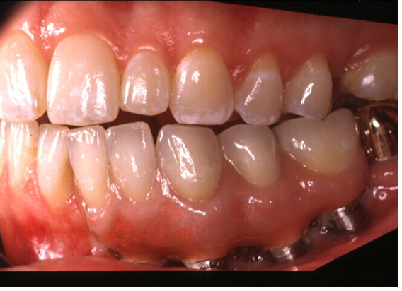 At the initial patient examination, several factors in addition to restoration shape should be considered when planning implant-supported restorations. History of periodontal disease, irregular maintenance visits, clinical appearance of the remaining teeth and soft tissue conditions may indicate increased risk of peri-implantitis. Patient dexterity, adaptability, willingness, and capability to carry out intended home care should be considered. Patient's mental conditions including dementia may influence the design of this as well as unrealistic patient expectations. A "High water original Branemark design" or no treatment may be indicated. Especially when implant location makes access, a fixed-removable design may be necessary to reduce risk of peri-implantitis may be indicated (Figures 42 through Figure 45). Considering that oral biofilm accumulation, even at two weeks post prosthetic insertion is documented, periodic removal of screw retained restorations is less effective than daily access to disrupt bacterial plaque accumulation.