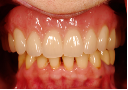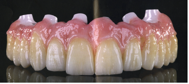 Many factors should be considered when designing implant-supported restorations to reduce the risk of peri-implantitis affecting physical removal of bacterial plaque at the FMG. Included are oral hygiene devices, accessibility, prosthetic shapes, and patient ability to comply with oral hygiene procedures. The design should be conveniently hygienic so patients can easily comply with the recommended oral hygiene procedures. Physical removal of bacterial plaque on the intaglio surface at and above the FMG reduces the risk of peri-implantitis in the sub-gingival transmucosal tissue around dental implants. The original fixed prosthetic design presented by Branemark, a "High water design", provided access to all surfaces for oral hygiene management without a patient complaint of food accumulation (Figure 9 and Figure 10). Notably, relief above the gingiva was not patient complaint with this design. Lack of embrasure access to the FMG and intaglio surfaces for oral hygiene management can lead to peri-implantitis (Figure 11 and Figure 12). Stein recommended a convex modified ridgelap pontic design with lingual and palatal access to facilitate plaque removal from the intaglio surface under pontics in fixed prosthetics with dental floss.20 These shapes should be standard for fixed implant-supported restorations whether individual or multi-unit restorations made of ceramo-metal or milled zirconia (Figure 13 through Figure 16).