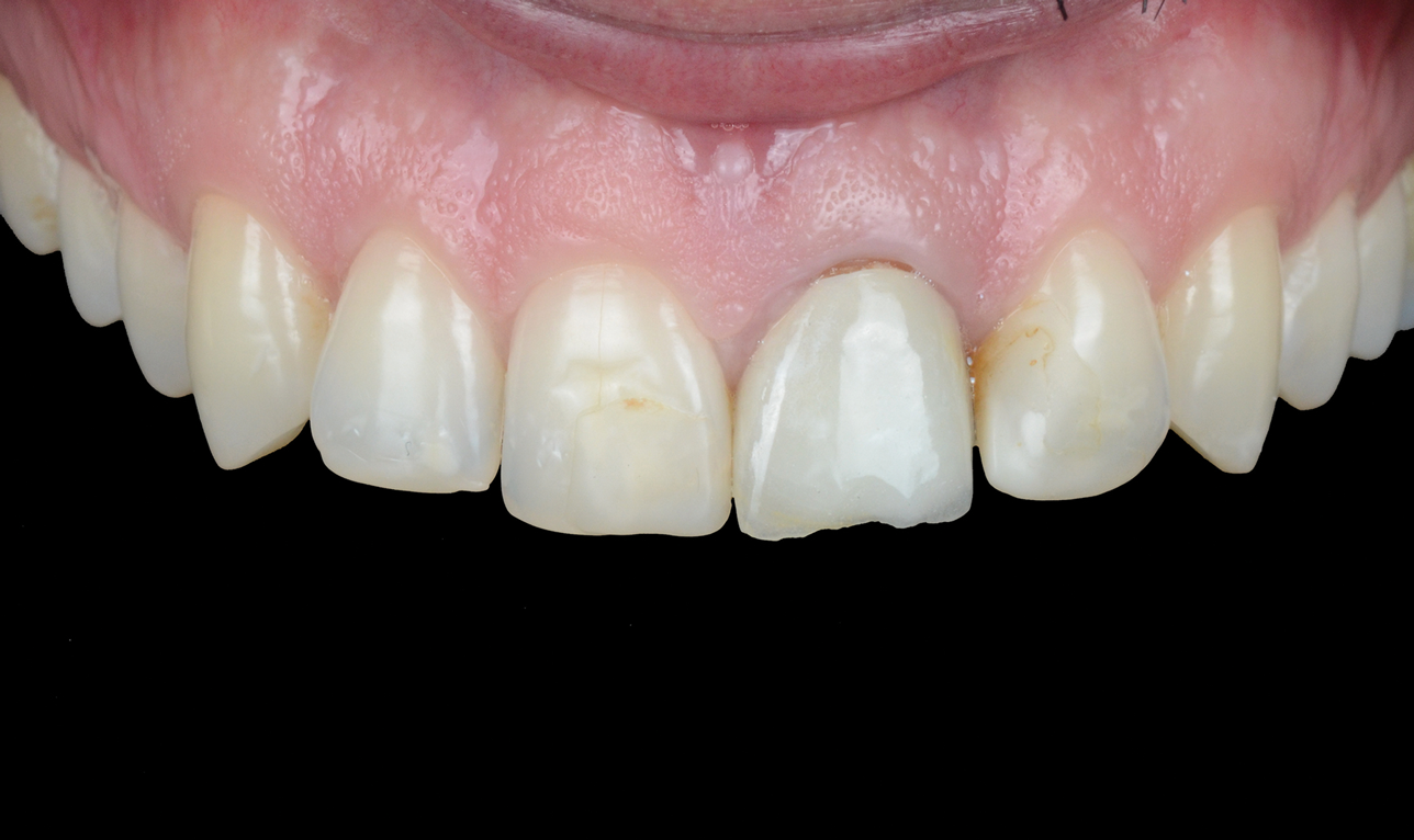 The case presented, an esthetic anterior case, provides an example of how clinicians can use a complete digital workflow, starting with the digital smile design and progressing to the computer-assisted design and manufacture of the final restorations. In this case, a patient presented to the author's (MR) office requesting to modify his compromised anterior esthetic situation regarding several extensively infiltrated composite restorations and a chipped crown showing a darkly stained endodontically treated tooth (No. 9). Following a comprehensive clinical and initial photographic assessment (Figure 1 through Figure 3), a digital smile design protocol (TRIOS Smile Design) was performed to develop a facially driven digital wax-up for the maxillary anterior teeth to address differences in tooth proportion and a deficient crown on tooth No. 9 (Figure 4 and Figure 5). Consistent measurements in such areas as tooth height and width and incisal edge changes act as a strict quality control mechanism, helping to ensure precision and accuracy throughout the design and treatment process.13-15