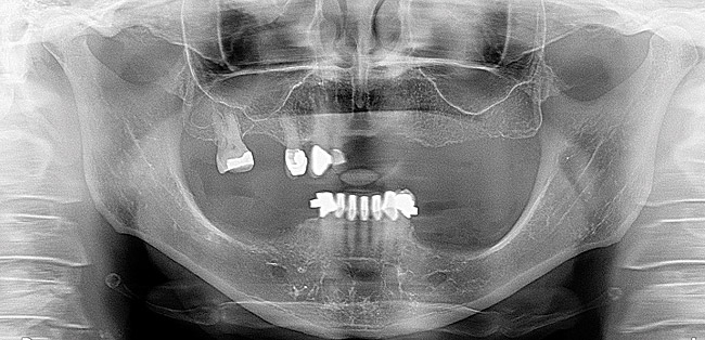 After a clinical examination was performed including diagnostic digital radiographs (Figure 2), diagnostic study models, photographs, and a CBCT scan, treatment options were discussed and the patient’s future expectations were addressed and documented. She had received a previous treatment plan and had been told she needed a sinus lift and a bone augmentation but decided against them. Her desire was to have a fixed solution so she would not have to remove her denture teeth.