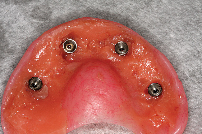 A fast-setting, hard-denture chairside reline material (GC America, www.gcamerica.com) was applied over the white caps to locate the position of the eventual screw access holes. This reline also provides hard-processed tissue stops between the implant/abutment sites. Based on the location of the healing caps, the laboratory technician would drill holes through the tissue side to the occlusal side of the teeth.