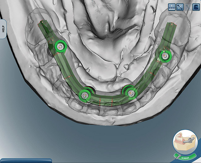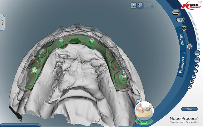 The laboratory technician made a small triad base-plate using at least two titanium provisional sleeves into the base plate. This allowed the restorative dentist to stabilize any required intermediate tooth try-ins. The teeth were set up, and a wax-up of the facial contours was produced. The facial and lingual contours of the wax-up were created as an exact replica of the finished product. The teeth were removed from the wax-up leaving a negative of the denture teeth in the wax around the arch. The master cast and baseplate without the teeth were forwarded to Nobel Biocare for scanning. Due to the fact that this particular technique and the implants can accommodate a wide range of prosthetics and abutments, high-strength zirconia or titanium substructures can be fabricated using CAD/CAM technology (Figure 8 and Figure 9).10,11 Therefore, the bar was designed on screen considering support for each tooth, and then it was milled and returned to the laboratory.