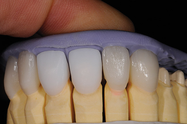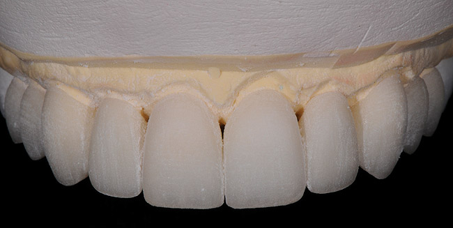 Next, the cervical dentin, which has some translucency, was used to further enhance a natural effect. Then the dentin shade was overlaid in full contour, using the index to determine the final length for the build-up. After the dentin cutback, a space was created for the incisal edge using high-value enamel (TI1), bleach, and Opal Clear (OE1). To minimize grayness, the OE1, which exhibits a bluish opal translucency, was mixed with the neutral translucent to dilute it slightly. The mixture was applied in a segmented lateral build-up, similar to a piano key. To create the incisal wall canvas, mamelon effects (mamelon light and salmon mixed half-and-half) were applied. As an overlay to that build-up, a thin layer of the OE1/neutral translucent mixture was used. The crowns were baked and re-fitted on the model. Then, the silicone index was tried-in to verify that the length matched that of the patient-approved temporary (Figure 7 through Figure 9).