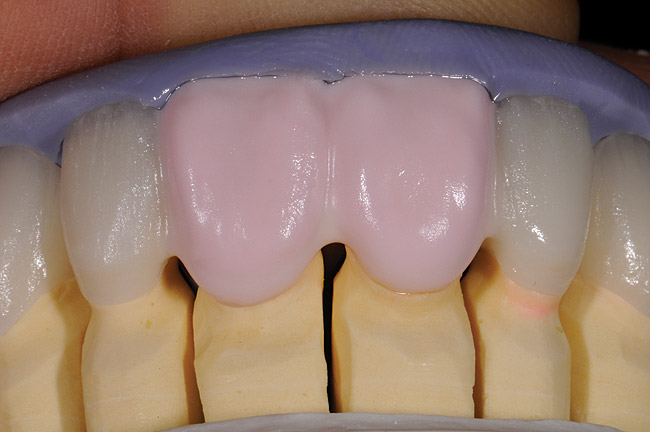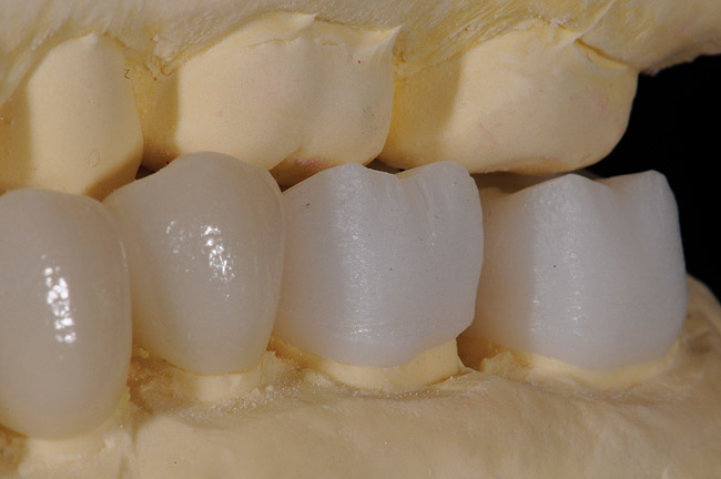 The cutback reduction for the upper posterior teeth required a minimal layering technique. Fabricated thickest for strength, the pressed material core for the posterior teeth was still able to achieve the same enhanced esthetics (ie, ceramic finish) as the anterior teeth due to this layering concept (Figure 10). After all of the units were shaped and texturized on the model, the contact points were checked, the soft tissue was removed to eliminate interference, interproximal spacing was closed, and contacts were tightened to help ensure minimal chairside time (Figure 11).