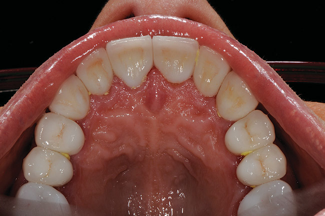 The patient presented for a restoration try-in. Mach-2® die silicone (Parkell, Inc., www.parkell.com) was used to stabilize the crowns and check the contact points and bite for final patient approval for shape, color, and alignment (Figure 13 through Figure 16). Once all of the dental team members were satisfied, the dentist placed the permanent restorations (Figure 17).