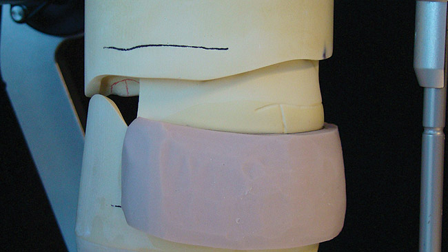Once all model work was accomplished, the case was mounted on Candulor’s CA II articulator (Candulor Dental, www.candulor.us) using the provided plaster rim and centering pin. Care was taken to ensure that the models were mounted according to the occlusal plane indicated on the plaster rim, and that this plane directly related to the occlusal notches provided on the CA II articulator using a red rubber band (Figure 6).
