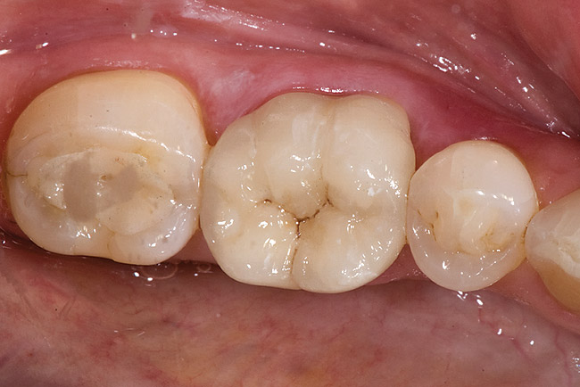 Next is the flexure risk assessment. Each tooth and existing restoration is evaluated for signs of past overt tooth flexure. Signs of excessive tooth flexure can be excessive enamel crazing (Figure 2), tooth and restoration wear, tooth and restoration fracture, microleakage at restoration margins, recession, and abfraction lesions. Often, the etiology is multifactorial and controversial. However, if several of these conditions exist, there is an increased risk of flexure on the restorations that are placed, which may overload weaker materials. Evaluation of this possibility is also based on the amount of remaining tooth structure. The more intact the enamel is, the less potential for flexure. The amount of tooth preparation can directly affect tooth flexure and stress concentration. There is much potential subjectivity in any observational assessment of clinical conditions; however, an assessment of flexure potential for each tooth to be restored is needed. A subjective assignment of Low, Medium, or High Risk for flexure is based on the evaluated parameters, as outlined below.