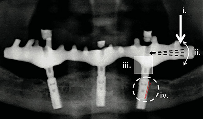 One hypothesis to explain the prosthetic failures and complications associated with the IRO and ISFP is that the mechanical environment established by implant placement is inadequate to permit proper construction of a robust and resilient IRO or ISFP prosthesis. Three different factors are essential to defining this mechanical environment (Figure 3). One is the magnitude of forces—specifically, bending moments, which are dependent on the magnitude of the load and the length of any cantilever. The second is the resistance of the prosthesis (of a defined material) against these relatively high and repetitive loads. The third factor is the biology of bone and its innate ability to respond to loading environments.