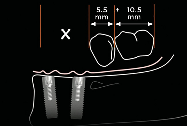 Any discussion of cantilever length requires that: 1) the position of the distal-most implant be anticipated; and 2) the number of teeth to be provided distal to that implant be defined. For the purposes of establishing a concept that meets the needs of most patients, the goal is to have the distal implant in the distal-most location that does not impose on the inferior alveolar nerve, which is generally located in the canine or first premolar region. Further, distal inclination of the posterior implants may place the prosthetic interface even more distal in the first premolar region.26