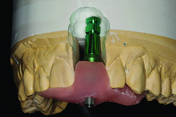 The restorative dentist can duplicate the contours of the extracted tooth for the new screw-retained provisional following these instructions: First make an index of implant position with a transfer coping. Then, either pour up a working cast or alter the cast used to fabricate the surgical guide. The cast is altered in the area of the implant fixture to allow the indexed transfer coping to seat with the appropriate analog attached (Figure 2).