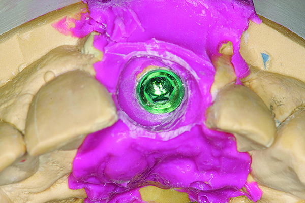 When the osseointegration is adequate and the soft-tissue contours are acceptable, an impression is required to communicate the implant fixture orientation in space and the soft-tissue positioning. In order to accurately mimic the contours generated by the approved provisional, a custom transfer coping is then fabricated.