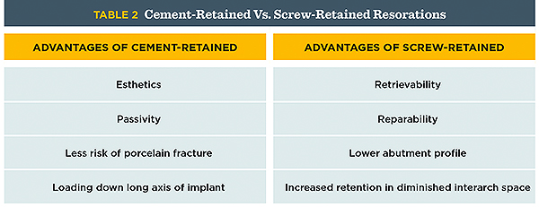 The selection of the type of restoration—cement-retained versus screw-retained—has been addressed by various authors.14,15 The advantages of each are summarized in Table 2. When possible, the author prefers a cement-retained restoration, which appears and functions more like a natural tooth. The main advantage of a screw-retained restoration, retrievability, must be weighed against the increased risk of porcelain fracture, or in the case of a lingual set screw, increased laboratory cost. A cement-retained restoration can be easily converted to a screw-retained restoration if needed by accessing the screw from the lingual. Extra care must be used in the design of the custom abutment such that the margin is placed no more than 2 mm subgingivally to allow for complete cement removal at time of insertion.