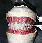 After the upper anteriors were set to the rubber index, the lower teeth were removed from the model following the same technique. Then, the lower anterior teeth were set onto the ridge, trying to come as close to an ideal setup as possible. Interoral measurements during diagnosis in relation to overjet and overbite were considered.