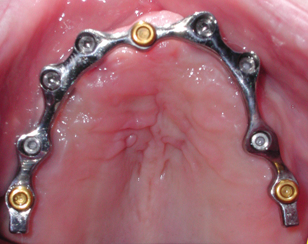 Fig 6. Ovoid arch form with 6 implants placed and connected with a bar, which was selected due to the shallow palate and vestibule.