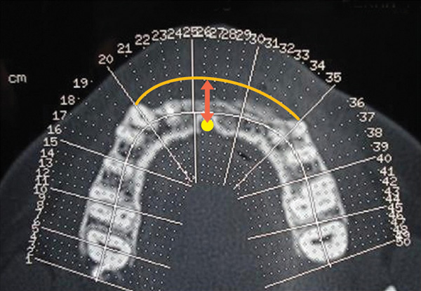 Fig 2. Maxillary arch comparing vestibular and palatal depths and lateral displacement of the prosthesis.