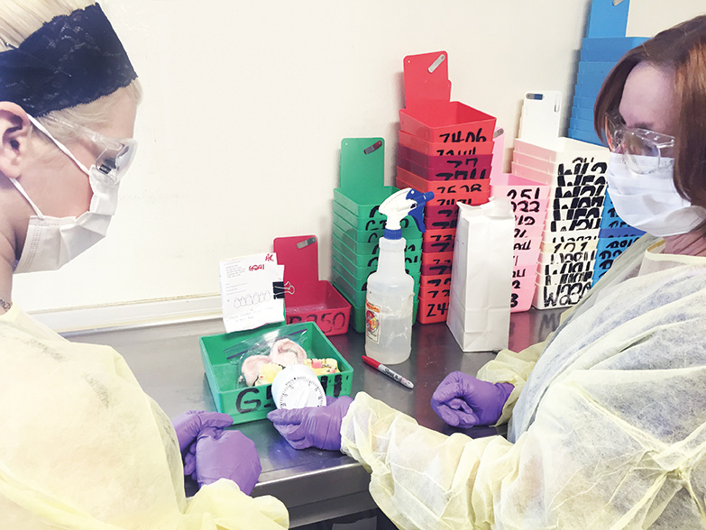 Laboratory application: Items that have been in a patient’s mouth come from the dental office. Therefore, they must be decontaminated before they are handled without adequate personal protective equipment (PPE).3 In a dental laboratory, this usually occurs in the receiving area, where the worker uses an intermediate-level, EPA-registered, hospital-grade disinfectant to disinfect all items that have been in a patient’s mouth. The Centers for Disease Control and Prevention (CDC) established the disinfection guidelines and recommends following the product label indicating the time required for destroying the bacterium, mycobacterium tuberculosis.