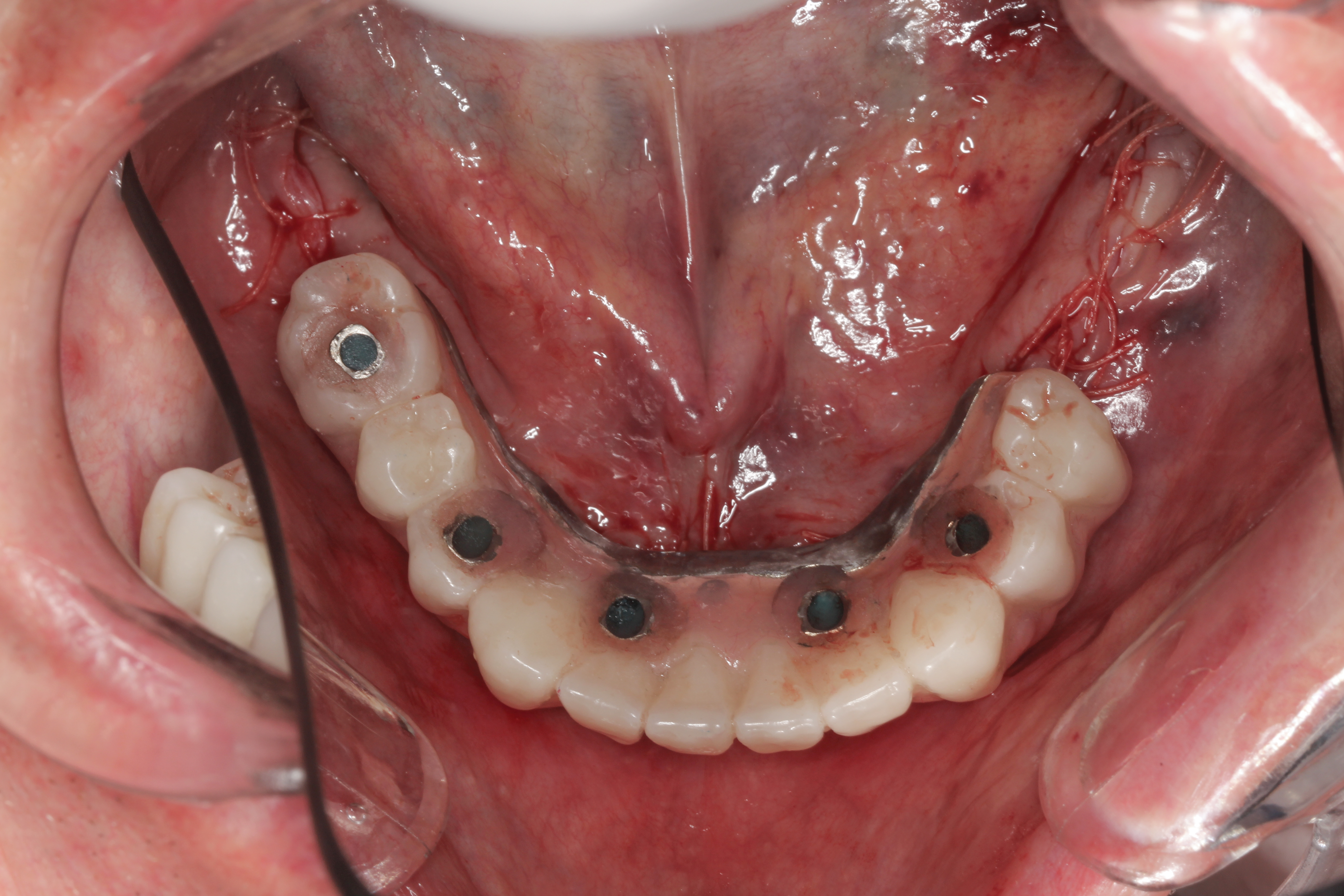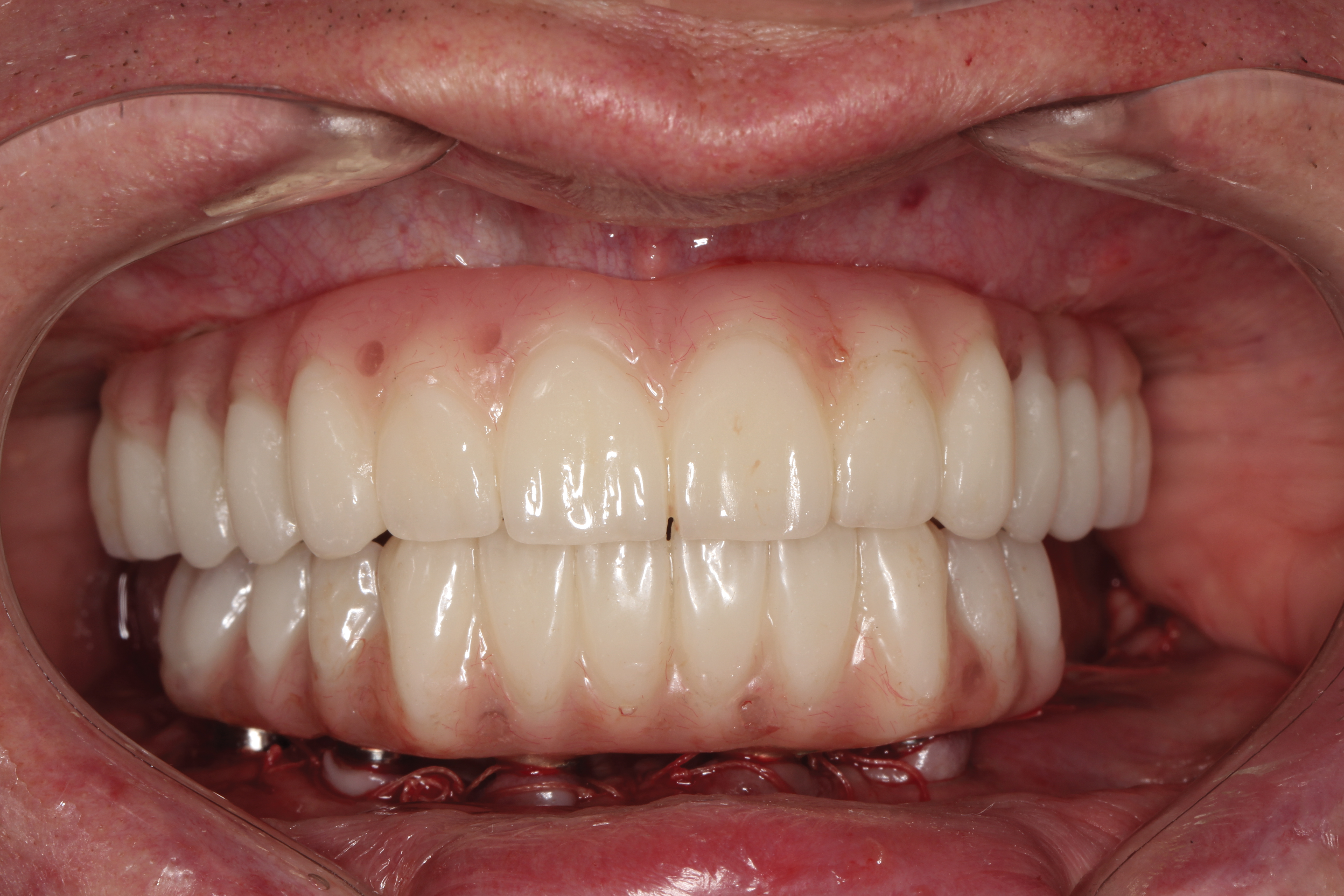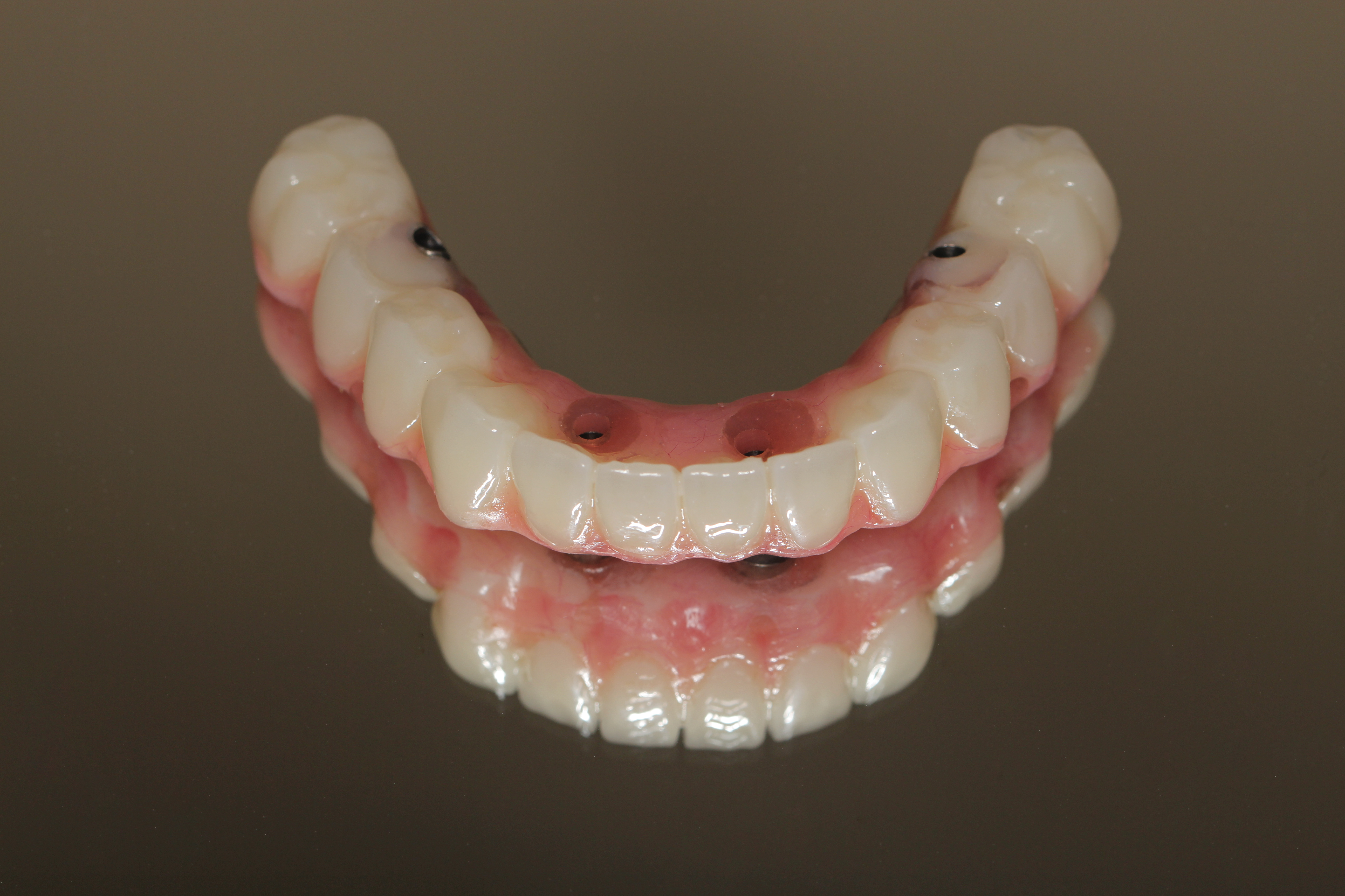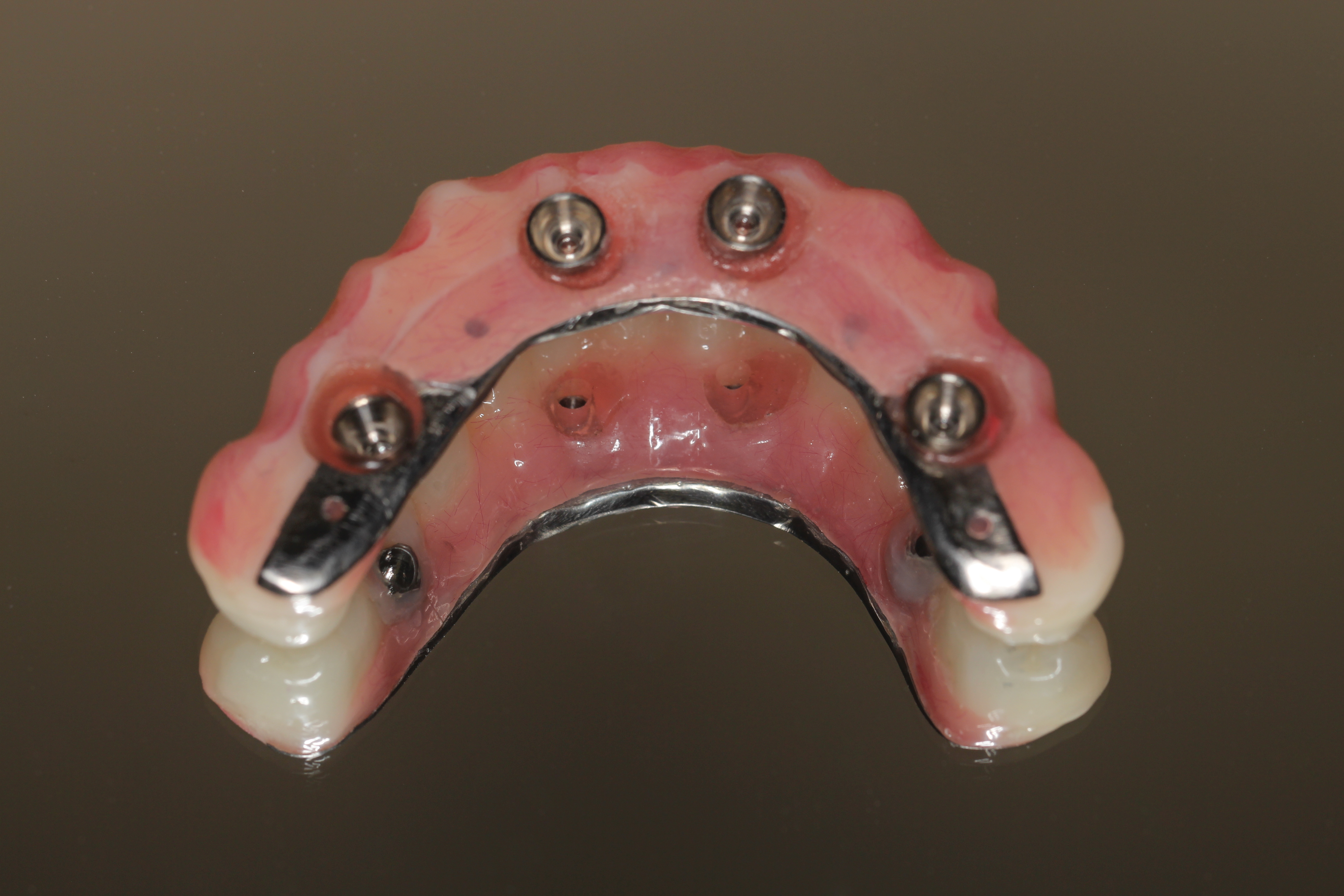 The prosthetic protocol usually involves multi-unit copings placed onto the abutments, which are then splinted with rigid wire and low-shrinkage autopolymerizing resin. This is followed by an open-tray impression with a rigid vinylpolysiloxane (VPS) material to capture both the implant and soft-tissue positions. The laboratory then completes the denture conversion, and the prosthesis is secured to the multi-unit abutments.