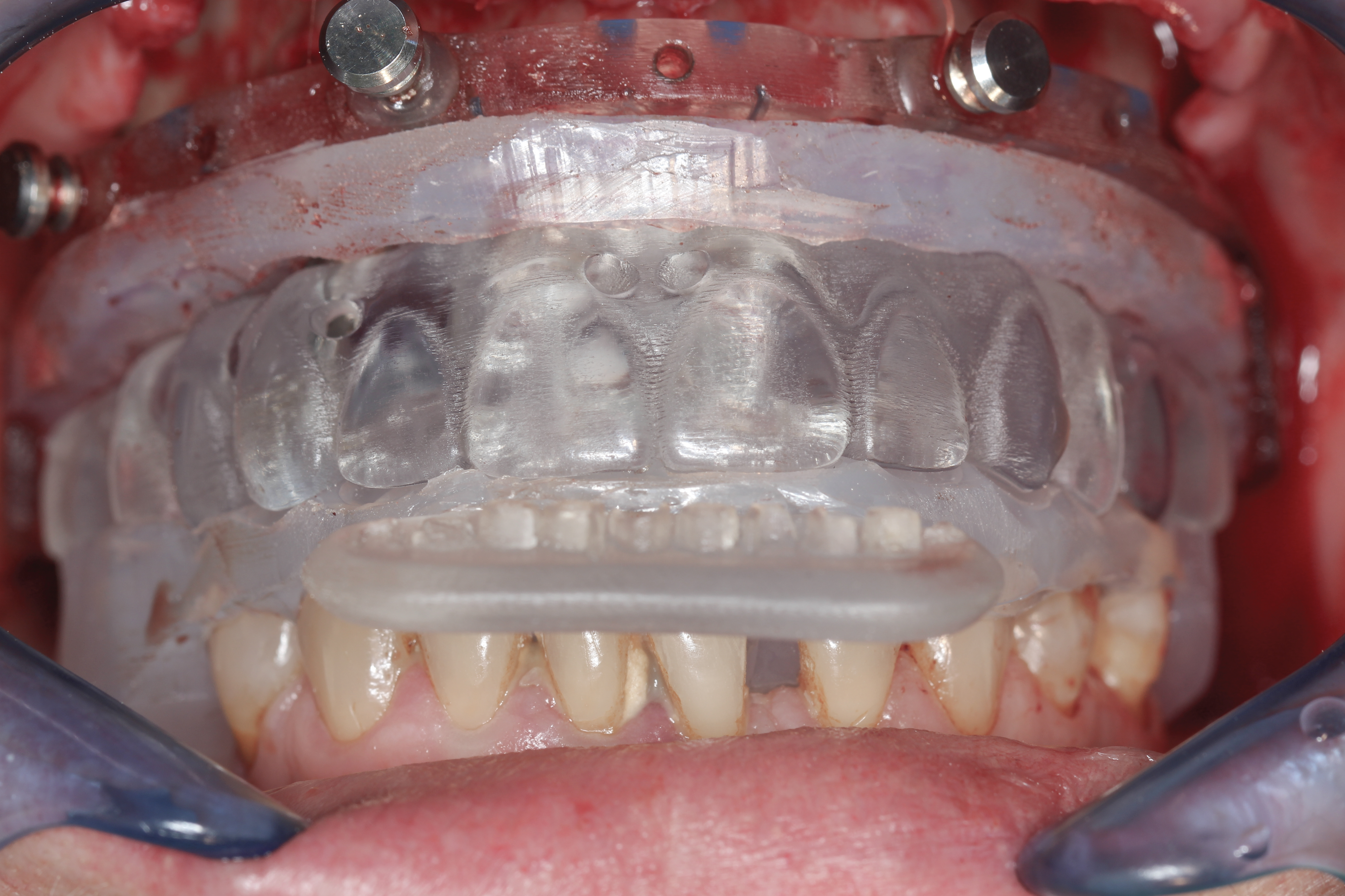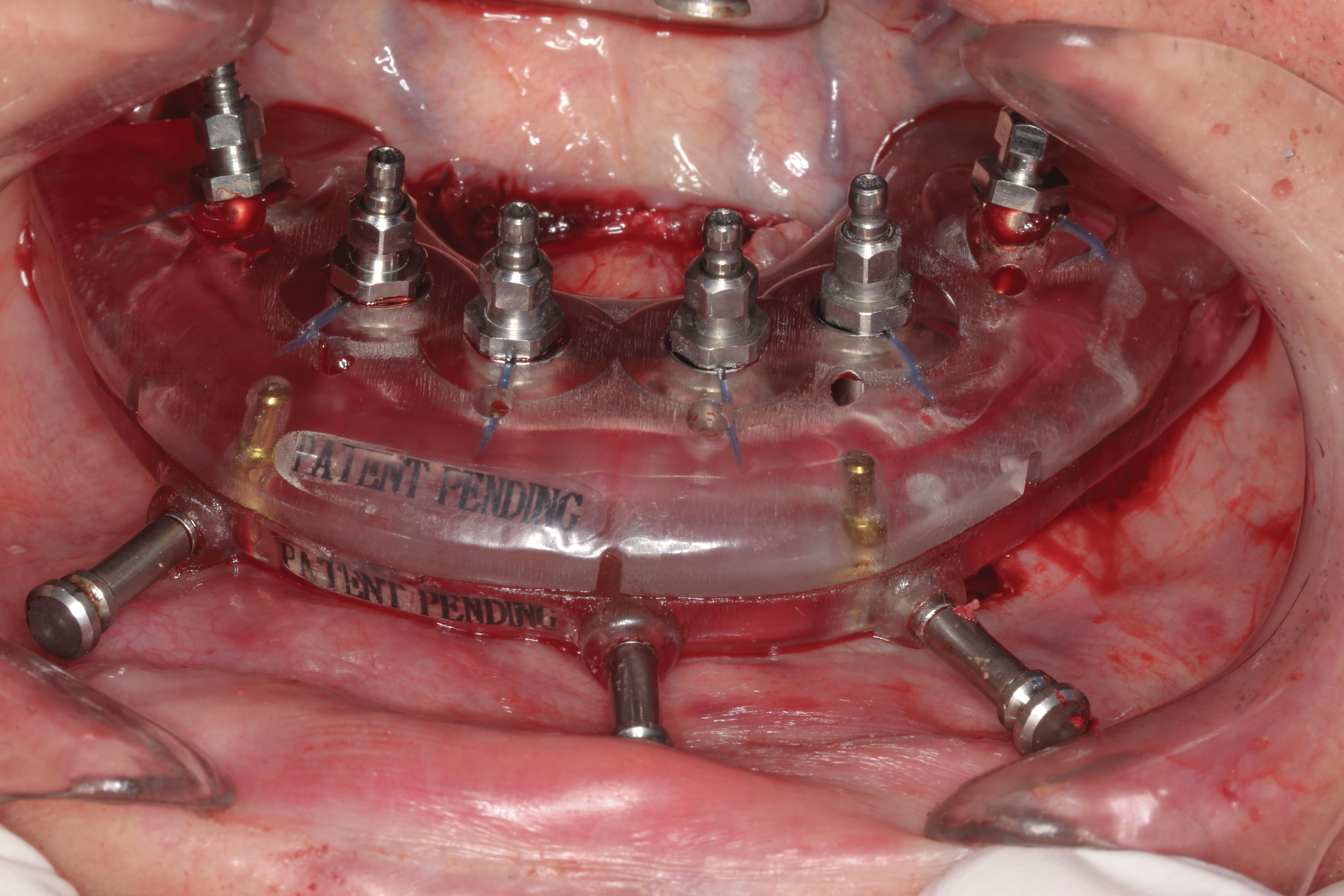 At this point the bone is ready to receive the implants. The surgical guide is pin indexed onto the bone foundation guide. Next, the appropriate surgical drilling sequence is followed to complete the osteotomies for implant placement. The implants are then loaded with the guided surgery mounts and placed through the guide to the prescribed and predetermined trajectory, depth, and rotation. The implant mounts and surgical guide are removed, and transmucosal abutments are placed along with pre-cut temporary cylinders. These multi-unit abutments are preselected for height and angulation as per the digital and clinical evaluation. After each one is placed, the prosthesis is positioned to verify proper position and angulation. The copings have also been precut to the correct horizontal dimension for proper fit with the prosthesis. A silicone spacer is positioned onto the bone foundation guide to position the prosthesis at the correct vertical and centric relationship and to preserve the predetermined tissue height. This is done in lieu of a rubber dam to prevent locking in the prosthesis. The long-term provisional (LTP) is then coated with a thin layer of petroleum jelly and placed over the temporary cylinders with a clear occlusal guide to lock in the occlusal position during the pickup process. The patient is instructed to bite into the occlusal registration, and flowable composite material is placed into the facial and buccal holes to pick up the prosthesis to the temporary cylinders (Figure 4).