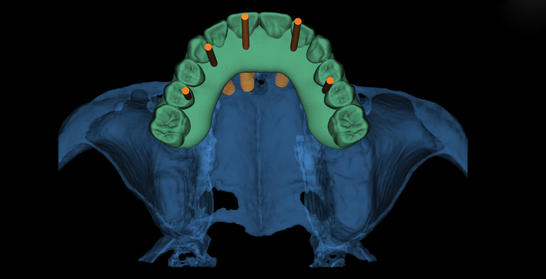 This fused data set served as the foundation for a virtual online interdisciplinary meeting that included the surgeon, restorative dentist, and laboratory technician. The virtual workup was based on all the assembled digital and clinical data (Figure 9 through Figure 12), and allowed for a true collaborative accountability22 among the respective clinicians and laboratory personnel. The treatment plan was then formulated among all team members and included optimal implant size, location, and angulation, as well as implant-supported immediate fixed maxillary and mandibular PMMA prostheses with bar that would be worn for 5 to 6 months prior to fabrication of the final fixed hybrid prostheses. A flapless approach with 5 implants was planned for the maxilla, and a flapped approach with alveolectomy and placement of 6 implants was planned for the mandibular arch. The patient was seen for final case presentation, informed consent, prescriptions, and scheduling the date of surgery.