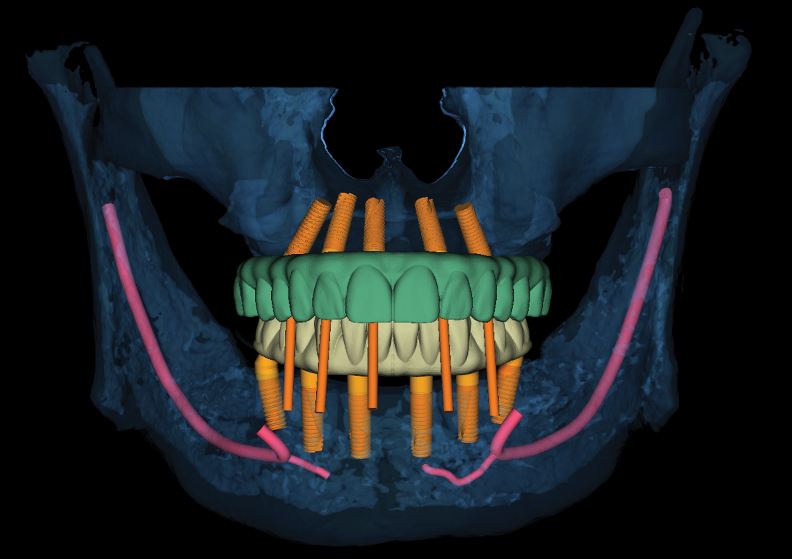 Software-driven interdisciplinary virtual workup—The fused patient 3D data sets are then ready for prosthetic and surgical planning based on the digital set of clinical photographs taken at appointment No. 1. An interdisciplinary team web meeting that includes the restorative dentist, surgeon, and laboratory technician is then scheduled to fully discuss the treatment plan. The surgeon will have performed a comprehensive clinical and CBCT-based sequential digital diagnostic evaluation prior to this meeting. Facially driven treatment principles include, but are not limited to: 1) facial and dental midline; 2) occlusal plane; 3) VDO; 4) force factors; 5) cantilever elements; 6) A-P spread; 7) bone volume and density; 8) implant and abutment selection and placement; 9) screw-access holes; 10) path of prosthesis insertion; 11) bone reduction; 12) discussion and virtual implementation of provisional and definitive prosthetic materials. Implants, abutments, and all other pertinent parts are then ordered for the patient-specific digital treatment plan.