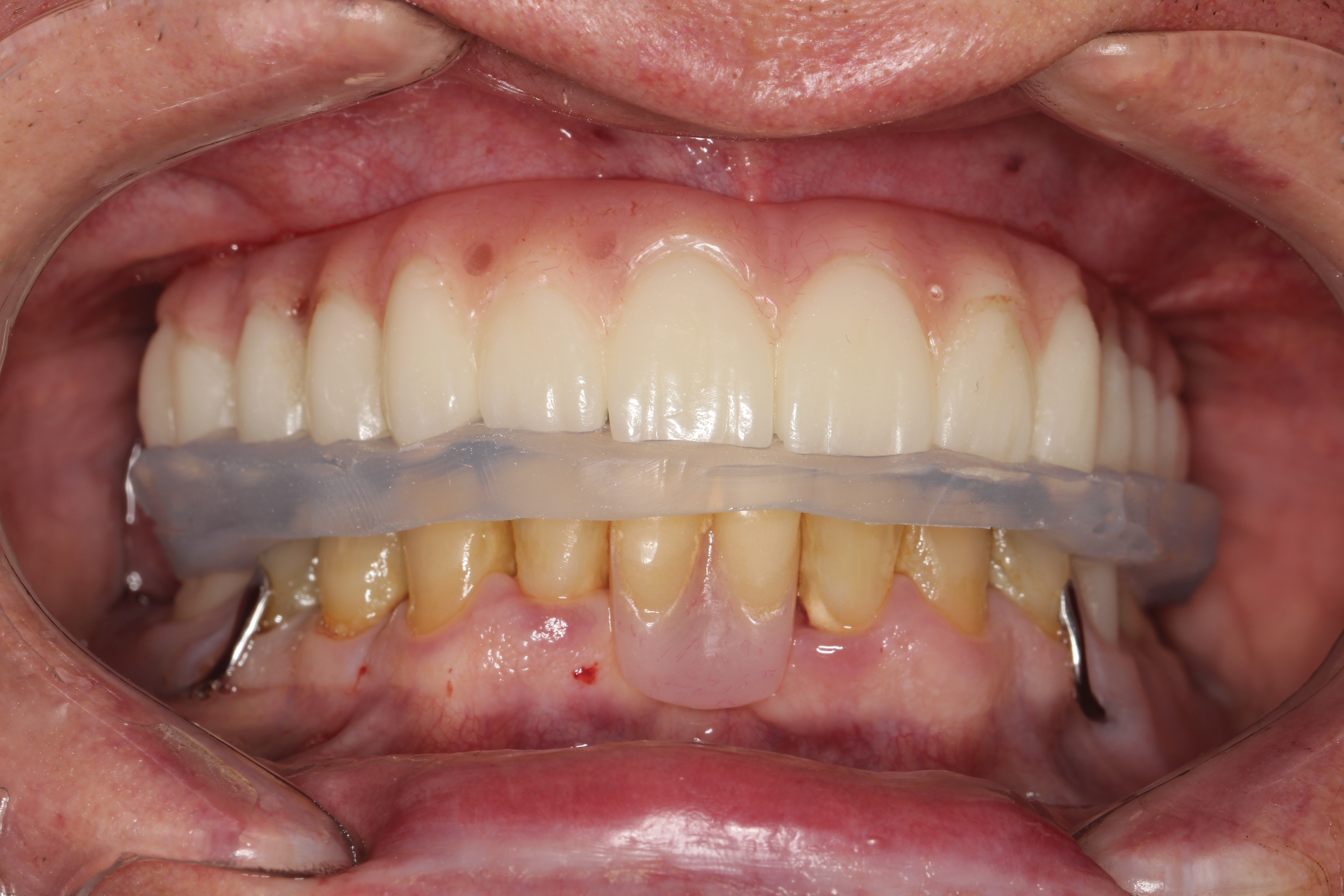 The remaining mandibular teeth were then extracted after full lingual and buccal flap reflection. The mandibular bone foundation guide was placed and indexed with fixation pins with a bite registration in place opposing the maxillary hybrid prosthesis (Figure 17). Next, appropriate alveolectomy was performed, followed by indexed placement of the surgical guide onto the bone foundation guide. Again, a fully guided digital protocol with appropriate drilling sequence was used to allow for placement of 6 NobelActive implants in the following sites: left first molar, left first bicuspid, left lateral incisor, right lateral incisor, right first bicuspid, and right first molar (Figure 18). All implants were placed with insertion torque values that ranged from 35 Ncm to 60 Ncm. The sole exception was the left first molar site implant, which had a 20-Ncm reading and was not loaded until the final prosthesis was fabricated. Next, the surgical guide and mounts were removed, preselected multi-unit abutments were placed, and periapical radiographs were taken to verify abutment implant fit. Temporary copings were placed, and the prefabricated petroleum jelly-coated PMMA hybrid prosthesis was seated with a silicone gasket. A pickup was done with flowable composite syringed through previously drilled buccal flange holes. The prosthesis was then removed, cleaned, and contoured with acrylic. Once again, soft-tissue closure was accomplished using 4-0 vicryl suture. Next, the bridge was secured to the copings and a slight bite adjustment was made (Figure 19 through Figure 22). The patient then returned for follow-up visits at 1 week, 2 weeks, 1 month, and 4 months for bite adjustment and supportive care prior to fabrication of the final prostheses.