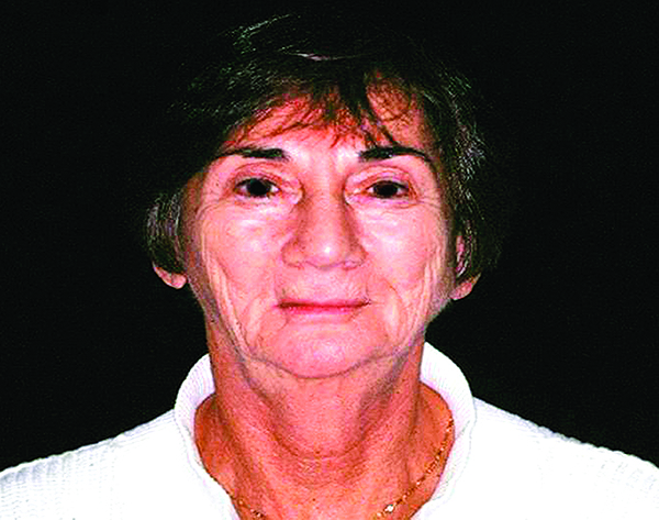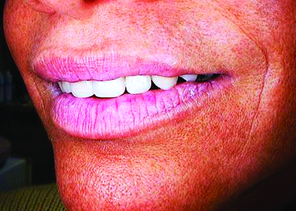 Figure 3 illustrates severe bone loss in the upper arch in a patient who has been edentulous for 20 years. The profile of the wax rim when viewed from the side may have two planes, with one from the angled reflection of the buccal vestibule and the second representing the location of the denture teeth. Often these two planes are necessary to provide the missing volume of alveolar bone and support for the superior aspect of the upper lip. In the completed denture (Figure 4), the two planes meet from cuspid to cuspid at the gingival line where the denture base meets the denture teeth supporting the upper border of the upper lip. Figure 5 demonstrates the effect of the required volume provided by the denture base and denture teeth to support and restore the desired appearance.