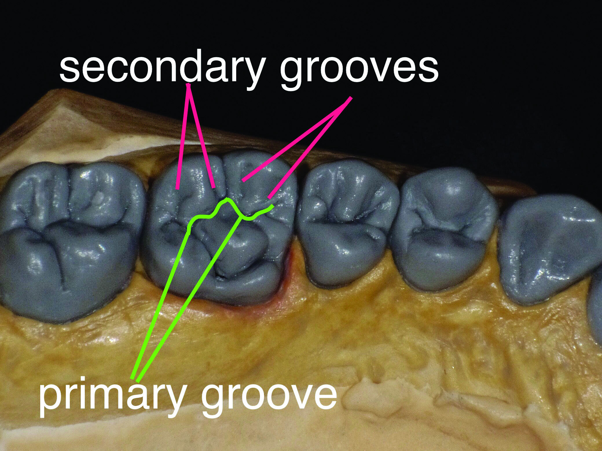 Looking at the occlusal surface of a molar, we see grooves, fissures, and pits. The grooves can be differentiated as primary or secondary (Figure 6). Primary grooves divide the cusps. Premolar teeth have only a primary groove, their central sulcus groove, which divides the tooth into a vestibular and a lingual half and divides stamping cusps from shearing cusps. Teeth with more than two cusps have a primary groove, but they also have one or more intercuspal grooves. These grooves originate from the central sulcus groove and radiate toward the vestibular or the lingual area, dividing cusps of the same side. Secondary or supplemental grooves are found on the inclined planes of cusps and are usually curved in nature. The direction of grooves depends on mandibular kinematics, because grooves are the approach and the getaway of moving cusps. For this reason, they have a crucial role in ensuring an immediate disclosure of the teeth.