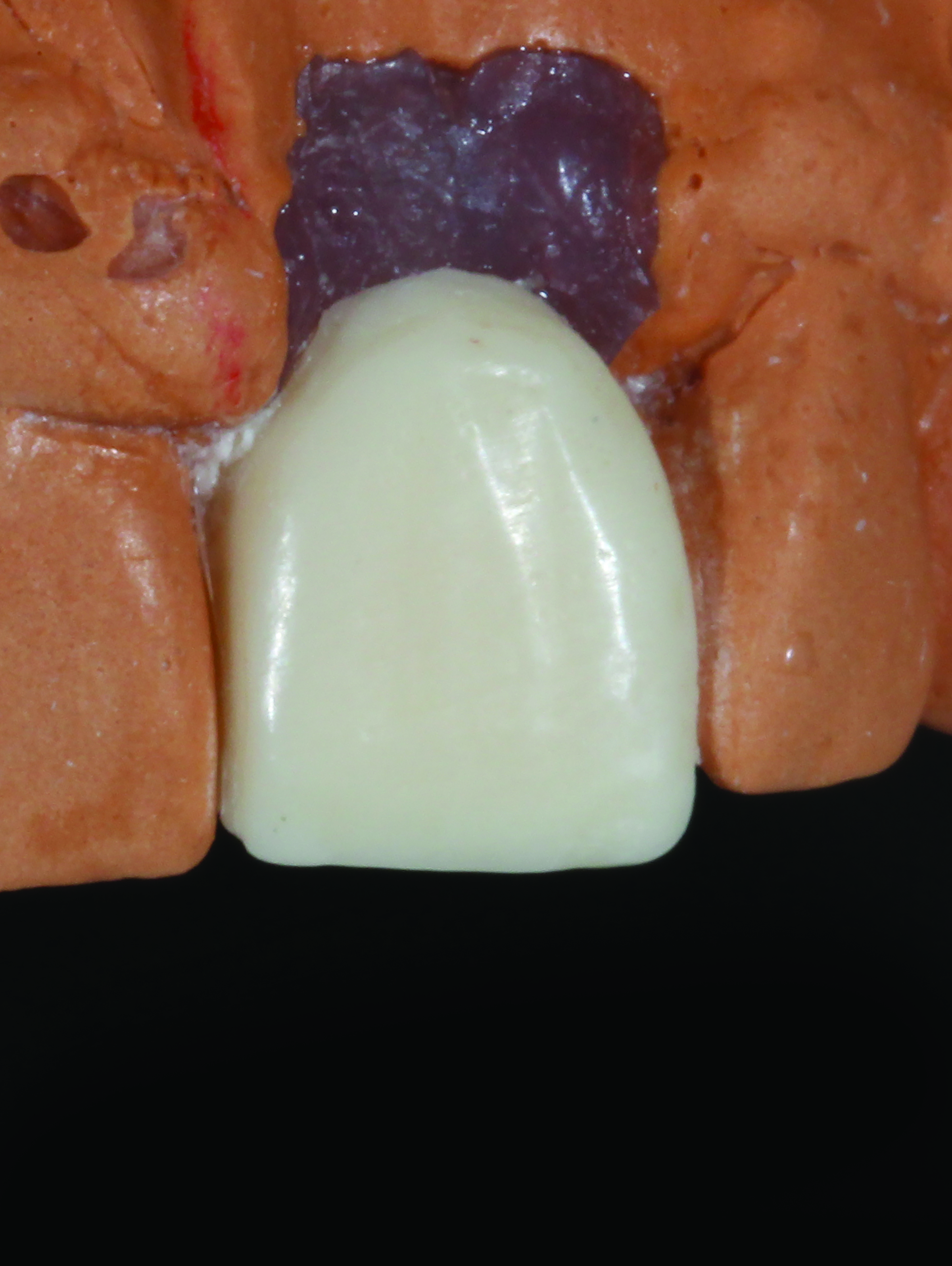 After setting, the dentist can remove the shell, contour, and trim the excess material around the margins in a manner similar to conventional teeth-supported provisional techniques. The positive stop portion that was used also should be trimmed (the palatal stop, in this case).