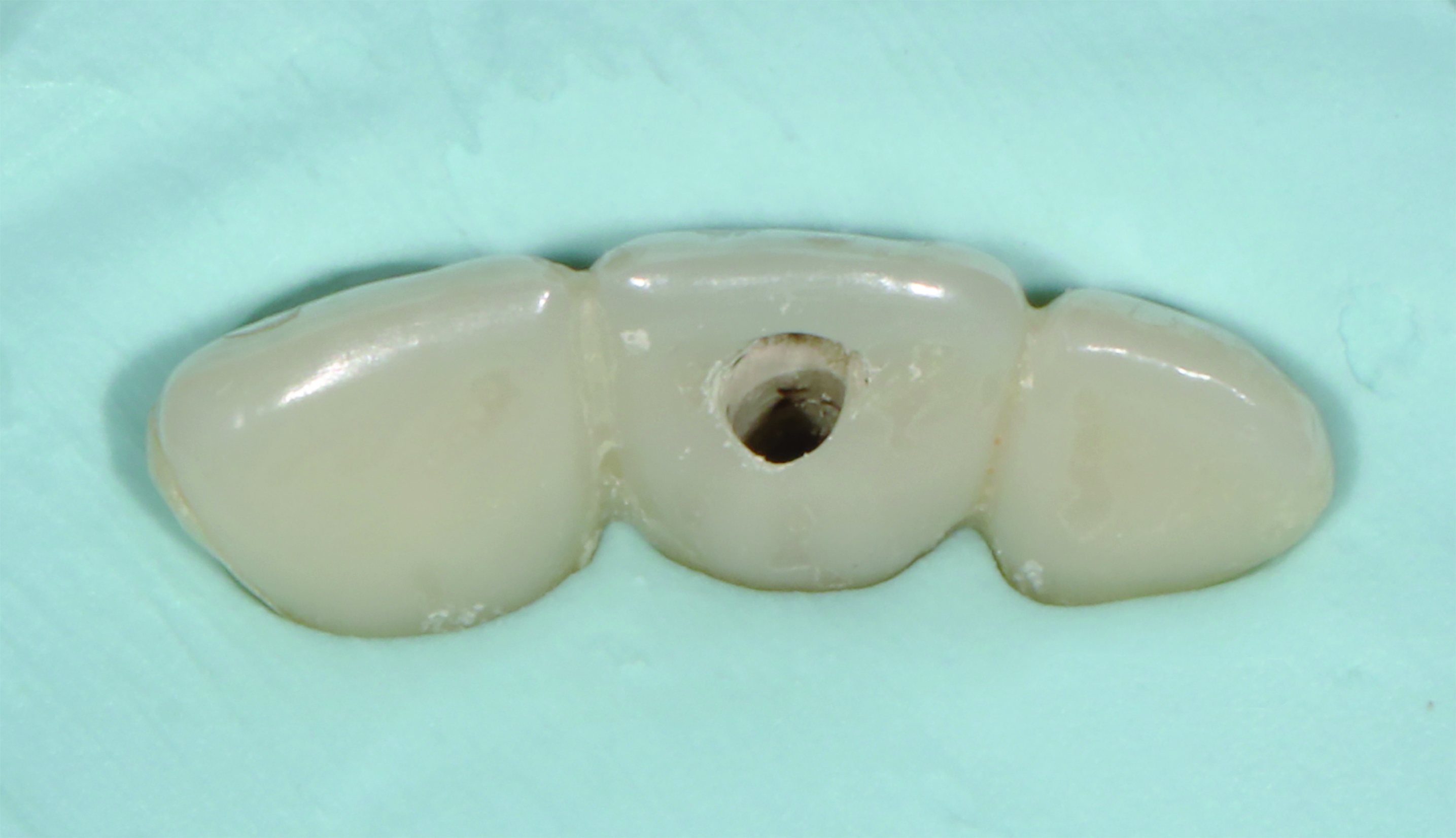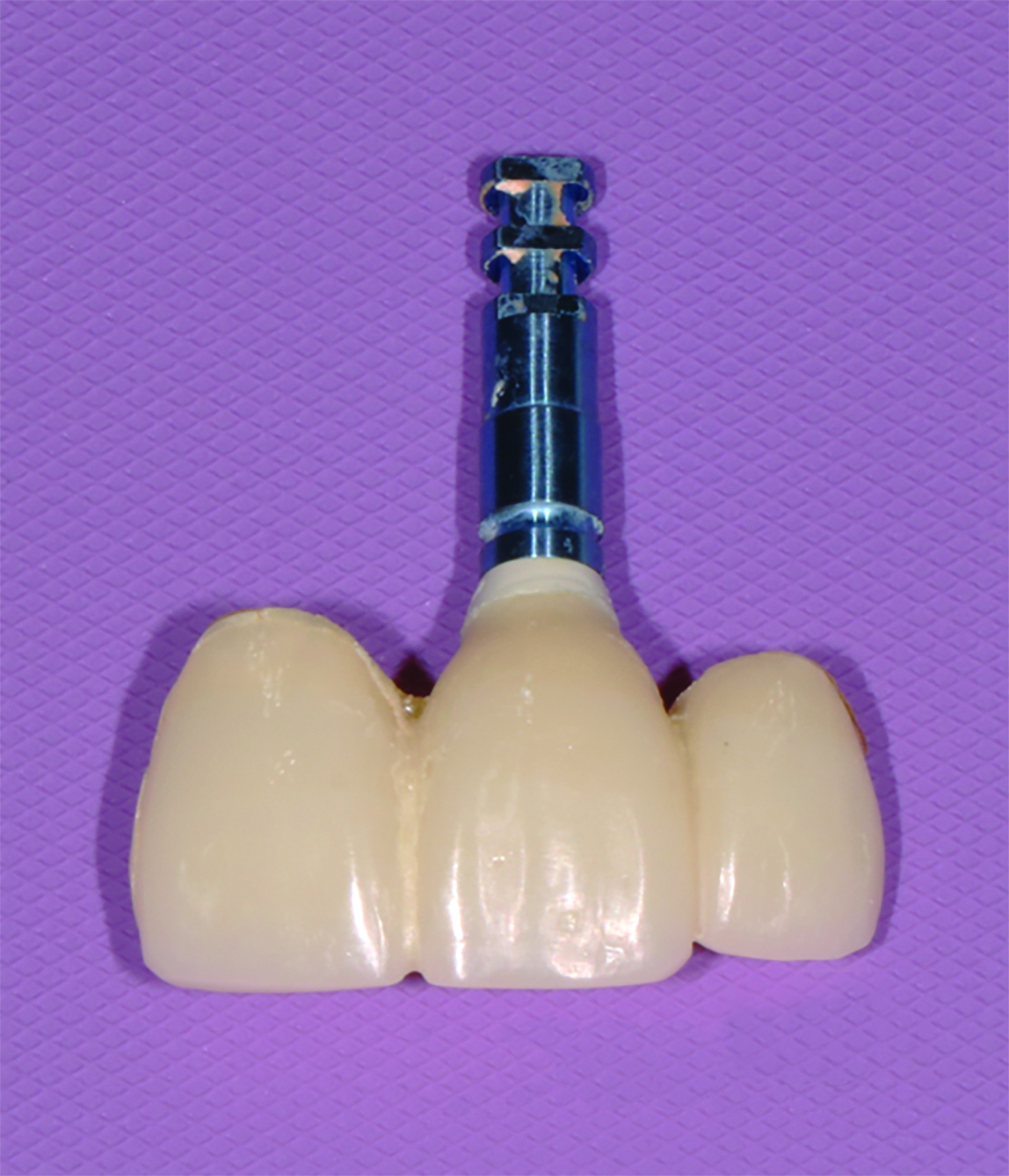 The abutment is then placed on an implant laboratory analog and polished adequately, and the provisional prosthesis should be polished as well. The provisional prosthesis is tried in, and the dentist rechecks occlusion and cement using temporary cement material, and cleans excess cement (Figure 17).