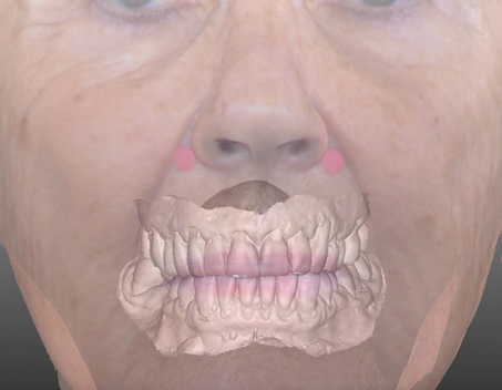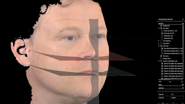1. The capture of the patient's face, which is reformatted into a photorealistic 3D digitized rendering using a series of cameras that make up the scanning system. This screen capture is used as the working foundation, which the authors call "face-in" design of treatment, supplementing the CBCT and IOS scanning data (Figure 6).
