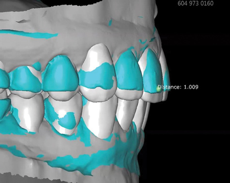 3. The face scan coupled with an optical scan or scanned impressions/casts, which are used to mock-up the desired restorative result by using a modeling software. This allows for creation of digital wax-ups and restoration designs, comparison of pre/post-restoration contours and positions using transparent overlays (permitting viewing of the anticipated changes relative to baseline through the use of 3D superimposition), and anticipation of endodontic procedures that may be required due to the expected reduction of tooth structure needed to achieve the desired outcome without altering tooth positions (Figure 8 and Figure 9). In turn, multiple try-ins and adjustments resulting from insufficient information are either entirely avoided or minimized. This detailed information is almost impossible to visualize using stone models. Also, it reduces working time in the design phase and "virtually" archives all proposals.