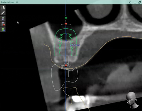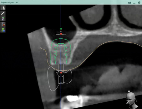 4. The entire set-up allows a preview of hard/soft-tissue augmentation or reduction requirements based on virtual and desired implant positions. It is here that decisions are made as to whether the plan can be achieved, or if pre-prosthetic steps such as orthodontic and orthognathic procedures are necessary to avoid open bites or reverse smiles. The benefit in virtually previewing the lip position relative to the transition zone (tissue-prosthesis interface) may especially be appreciated in all-on-4 or -6 full-arch implant restorations. Bone reduction guides or planned implant positions relative to a "virtually" reduced ridge to allow apical correction of the tissue-prosthesis interface are critical to the esthetic success of a prosthesis. "Face-in" planning literally eliminates this challenge (Figure 10 and Figure 11).