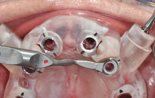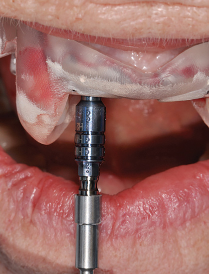 From the data and collaboration in steps 1 through 3, surgical guides can be fabricated for static surgery, and when indicated, prosthetic components, such as custom healing abutments, provisional crowns, or fixed partial dentures, can be produced for delivery at the time of surgery to guide soft-tissue healing. The static approach, better known as computer-guided surgery, refers to the use of tissue-tooth or soft- and hard-tissue-supported surgical templates. In essence, the virtual implant position planned from the CBCT, IOS, and face-in data sets is reproduced. The guide is produced with master cylinders (portals) through which the osteotomy preparation drills are introduced, and in full-guidance cases, the delivery of the implant is carried out (Figure 14 and Figure 15). Dynamic guided surgery or computer "navigation" traces the virtual implant position directly from CBCT data and employs motion tracking or real-time tracking technology to prepare the implant osteotomy. This makes it possible to determine the actual position of the surgical drill on the reconstructed 3D image provided by the CBCT. The surgeon is guided to the position that was planned preoperatively while he or she performs the surgical procedure. Examples of dynamic navigation systems are Navident (ClaroNav, claronav.com), X-Guide Dynamic 3D Navigation (X-Nav, x-navtech.com), Image Guided Implant (IGI) Dentistry System (Image Navigation, image-navigation.com), Inliant® (Navigate Surgical, navigatesurgical.com), and YOMI®, a robotic haptic guidance system (Neocis, neocis.com).