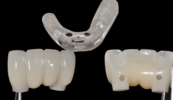 With today's monolithic, stain-only occlusal surfaces, any modification can contribute to a poor esthetic result as the coloration is removed down to an underlying monotone white appearance. Designs derived from the digital wax-up can be verified and approved in a virtual meeting, much like that of the implant and surgical guide strategy steps. However, in more complex cases where there are some variables that might need to be addressed, laboratories can mill a prototype to have the dentist and patient approve. This could be a nonfunctional prototype for the patient to try in at the appointment only or a functional prototype that the patient can wear for a period of time. Completing any adjustments at the prototype stage can greatly reduce remakes or the need for the dentist to make adjustments to the final restoration. Once completed, the restorations are either cemented or screw-retained according to the manufacturer's instructions.