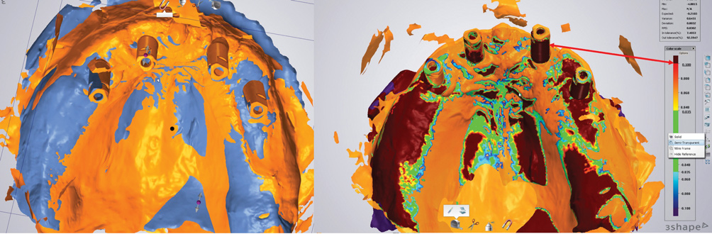 Scan flags themselves can contribute to inaccuracies associated with their shape or design. For example, their depth in the tissue affects how much of the flag remains visible; the torque applied to insert them is a factor; the material of their mating surface to the implant (eg, distortion of polyetheretherketone base material compared to titanium) is a consideration; and the amount of handling and number of uses the scan flag has experienced is a factor. The authors also have found through evaluations that the use of multi-unit abutment scan flags, which thus far has been sparsely studied, resulted in significant deviations from conventional impressions comparing the same cases using heat-scan analysis (Figure 22). Presently, in completely edentulous situations involving the scanning of four or more implants, obtaining digital impressions from a specific IOS remains a challenge.