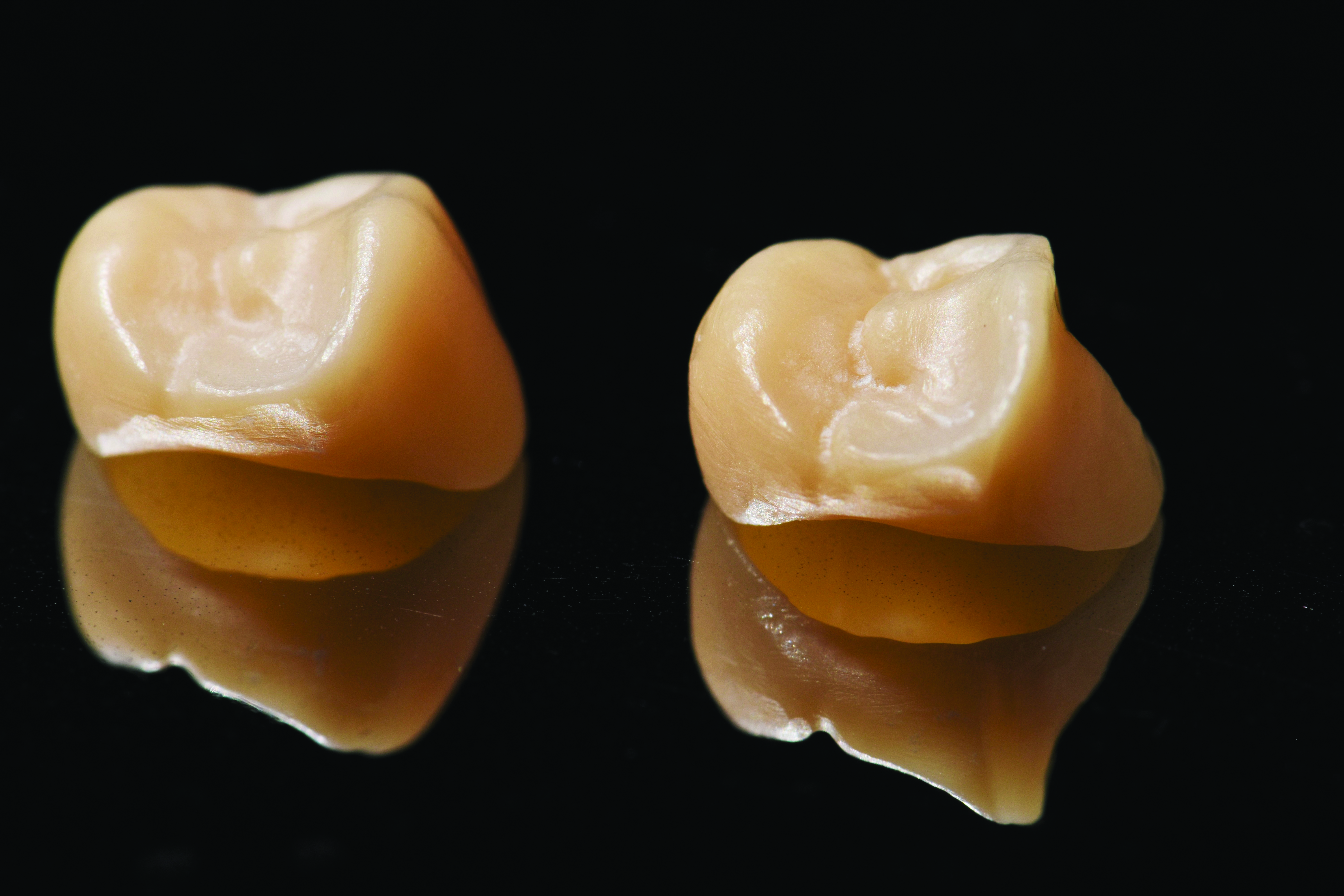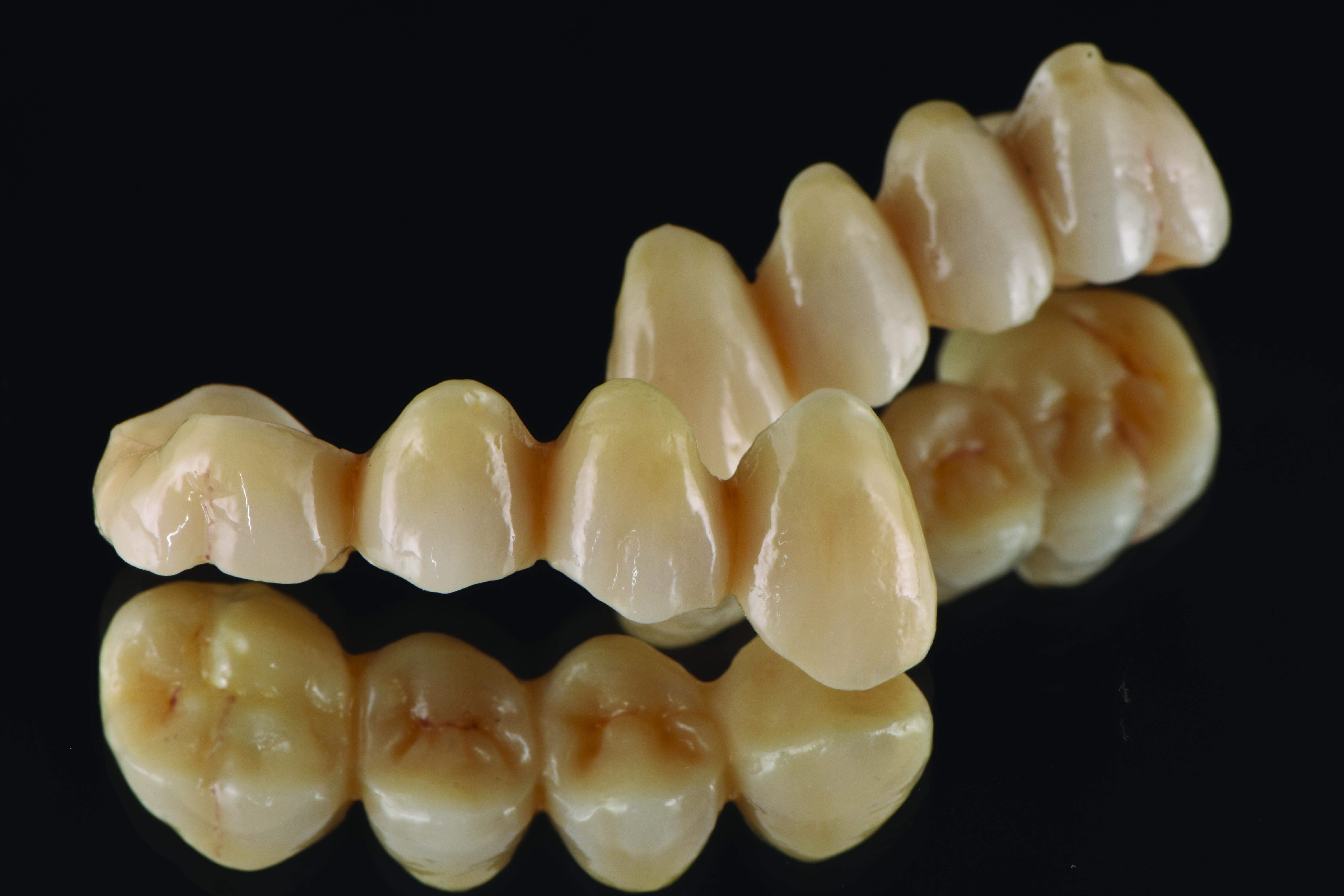 These ceramics consist of a porous crystalline matrix with glass infiltrated among the porosities. Primarily fabricated using a method called slip casting, crystalline-based ceramics with infiltrated glass are mainly comprised of an alumina matrix that can be augmented with other fillers, such as magnesia and zirconia.3 Crystalline-based ceramics require preparations with at least 1.2 mm of space, but 1.5 mm of space is preferred when masking or changing shade. The preparations should be designed to permit a 0.5-mm core as well as 1 mm of porcelain to achieve optimal esthetic results.4