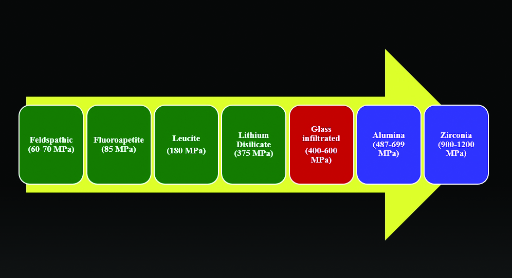 Figure 4 illustrates the order of dental ceramics in terms of flexural strength.3 Although some studies have shown that flexural strength is not as clinically relevant as other material properties,9 it still provides the dentist and the laboratory technician with an idea about the strength of the ceramic, which informs selection of the proper materials. Although zirconia has the highest flexural strength, it cannot always be used monolithically because of its poor optical properties, especially in anterior cases. The other factor that is crucial to consider is CTE. Studies have shown that CTE mismatch in bilayered all-ceramic restorations can lead to technical complications such as chipping or fracture.16
