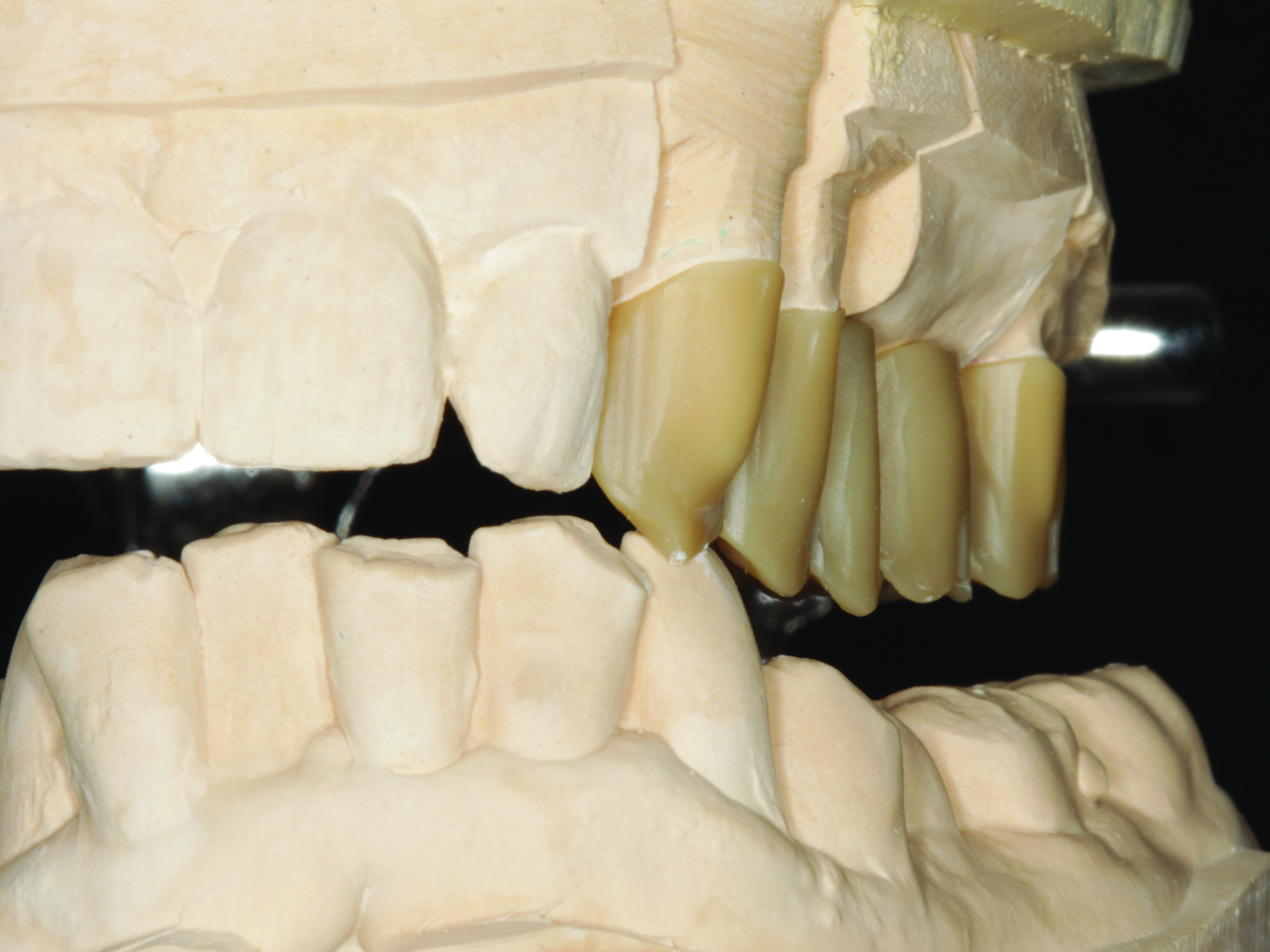• Occlusion. Evaluating the patient's occlusion and the occlusal scheme is important in both restorative dentistry and prosthodontics. Eliminating any occlusal interferences in excursive movements and adjusting the occlusion with the design of new prostheses can lead to more durable outcomes. When fabricating monolithic prostheses with facial cutbacks, no occlusal contact should be designed at the interface between porcelains for maximum intercuspation position and excursive movements (Figure 6).21