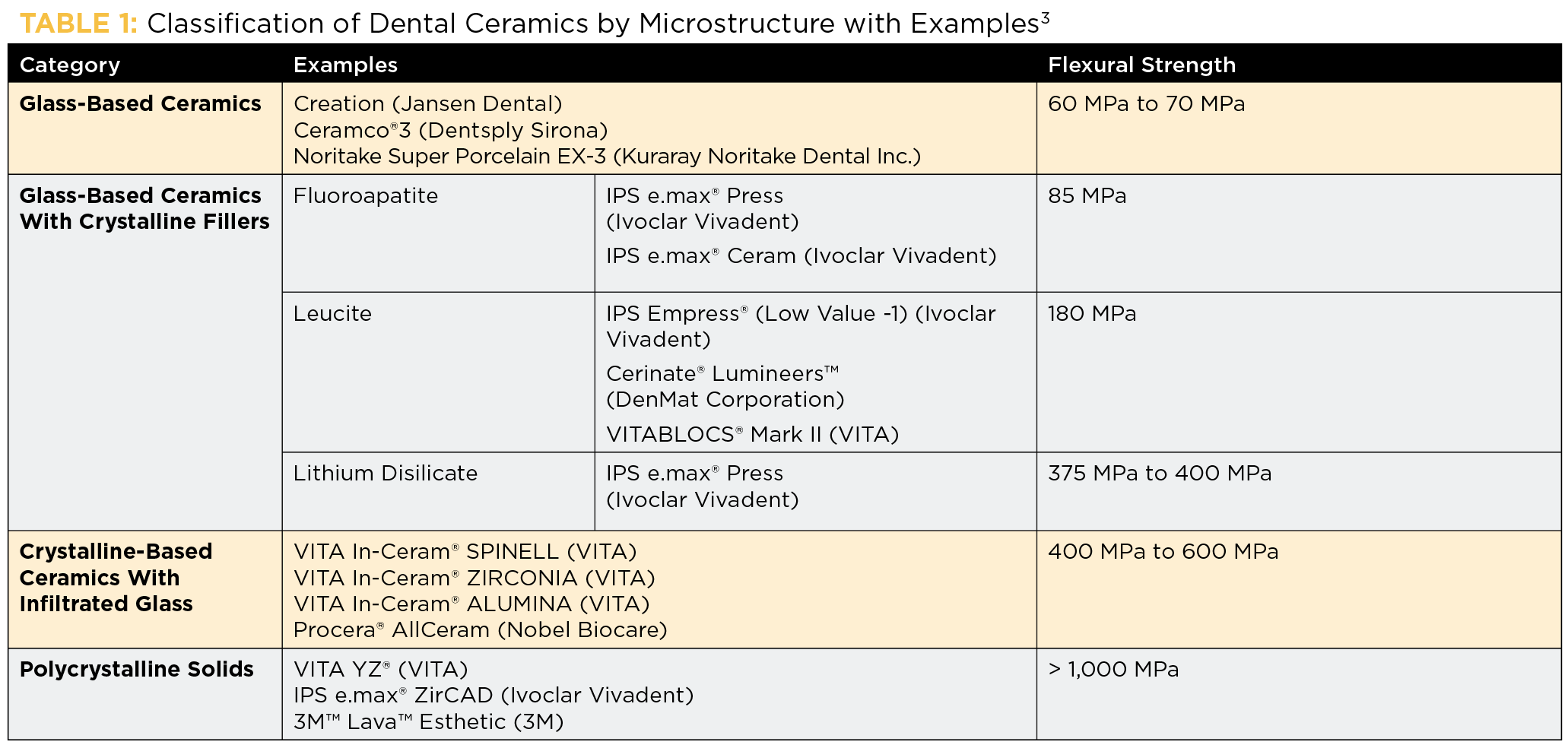 Dental ceramics consist of two phases, the glassy phase and the crystalline phase. According to the literature, one way that dental ceramics are classified is based on their microstructure. Regarding microstructure, Giordano and McLaren categorized ceramics into four groups: glass-based ceramics; glass-based ceramics with fillers, usually crystalline; crystalline-based ceramics with glass fillers, and polycrystalline solids (See Table 1).3