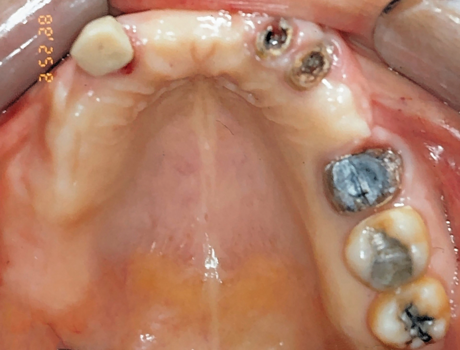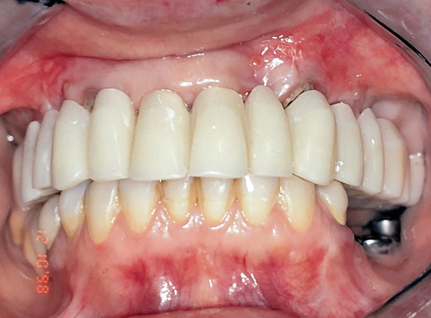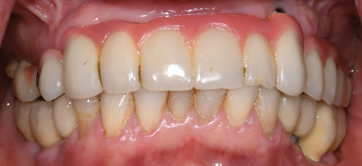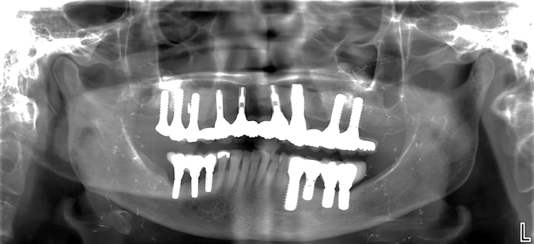 In 2020, the patient presented to the NYUCD Periodontology and Implant Dentistry Clinic. A clinical examination and radiographic evaluation showed that the patient's maxillary arch still exhibited good peri-implant soft-tissue health and stable marginal bone level with slight bone loss on implants Nos. 2, 6, 8, and 11 (Figure 18 through Figure 20). The maxillary prosthesis showed adequate stability with a slight chipped suprastructure on the porcelain on the right side. The patient was advised to substitute the implant-supported, screw-retained hybrid acrylic complete denture in the maxilla with a fixed, implant-supported, screw-retained prosthesis, which she declined due to financial considerations.