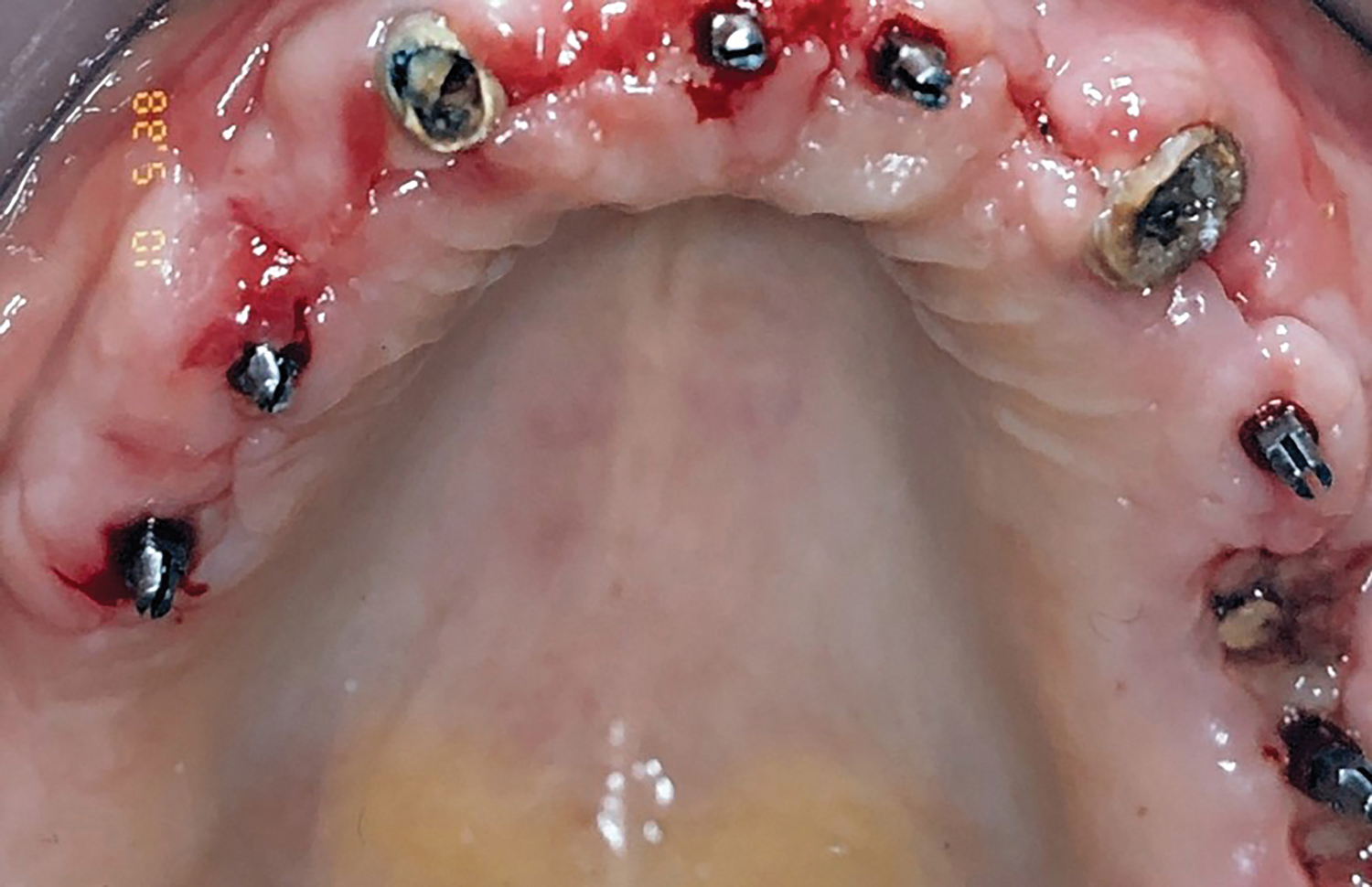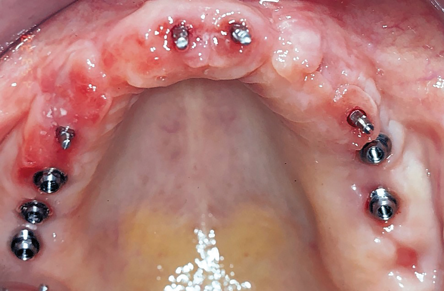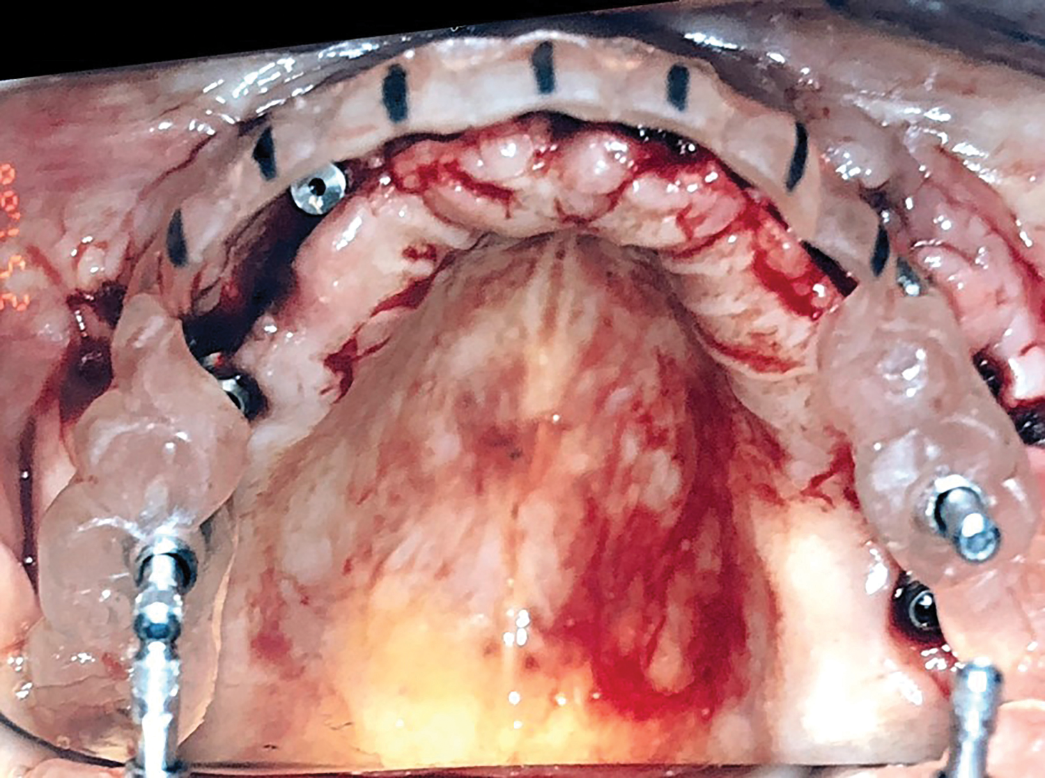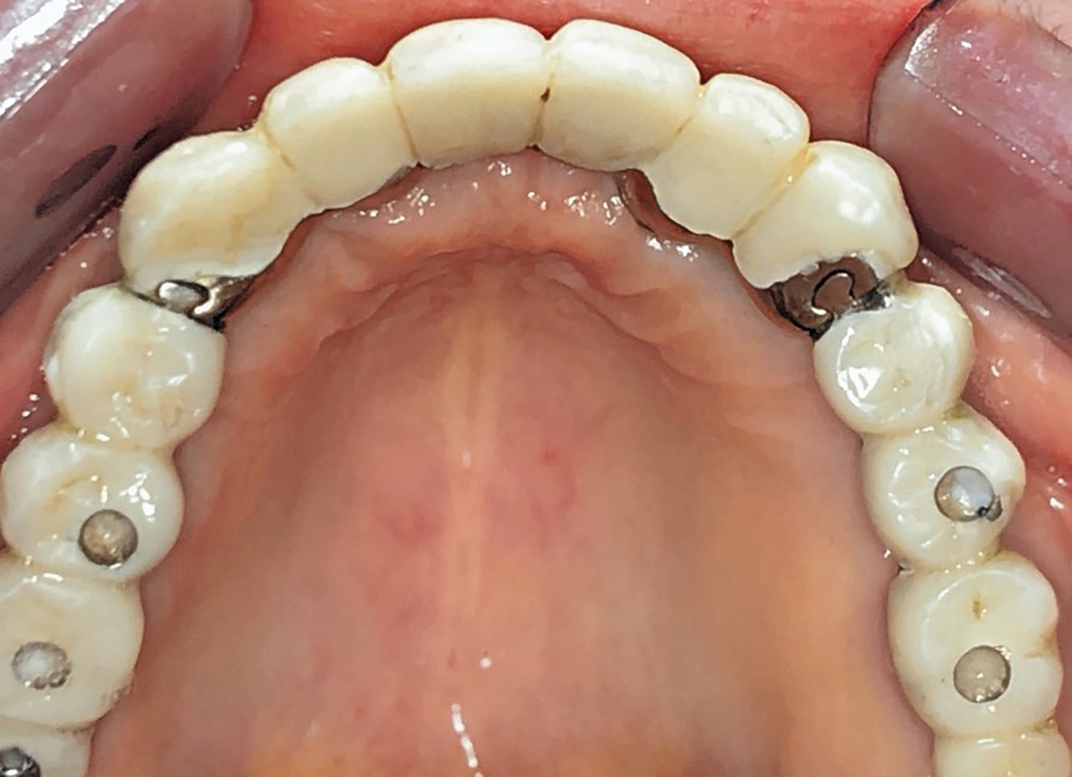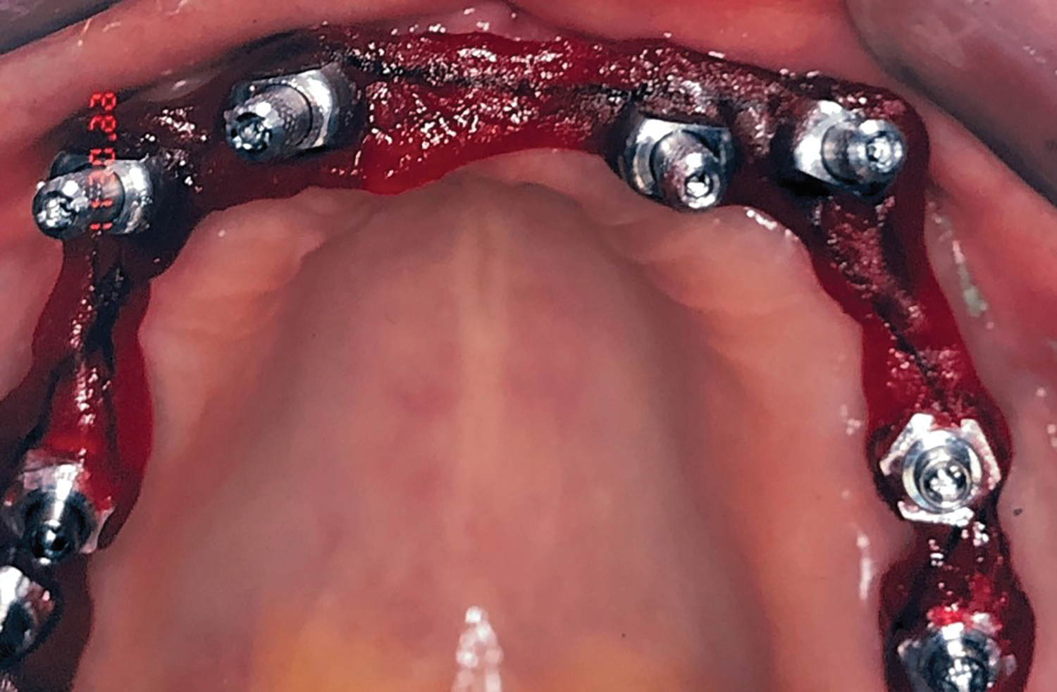 Acrylic resin was then added to the metal bar. The bar was removed to verify a parallel path of insertion and then placed back into the proper position. The maxillary fixed provisional prosthesis was relined with acrylic over the metal bar, abutments, and TIs (Figure 6). The titanium bar was incorporated into the transitional provisional prosthesis. The patient was instructed to close into a previously determined vertical dimension of occlusion until polymerization of the reline material occurred.