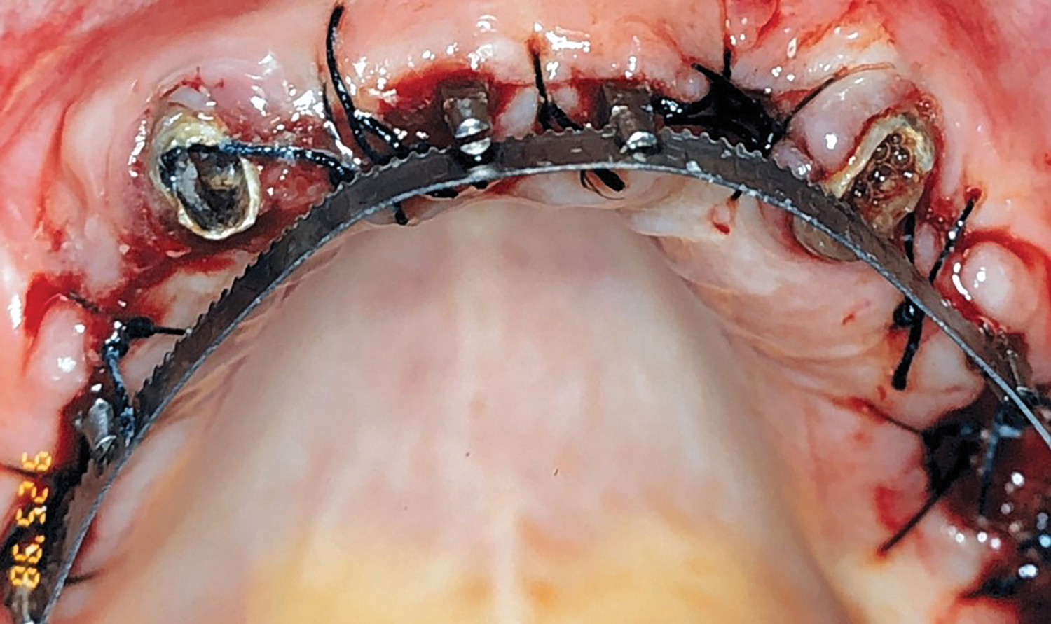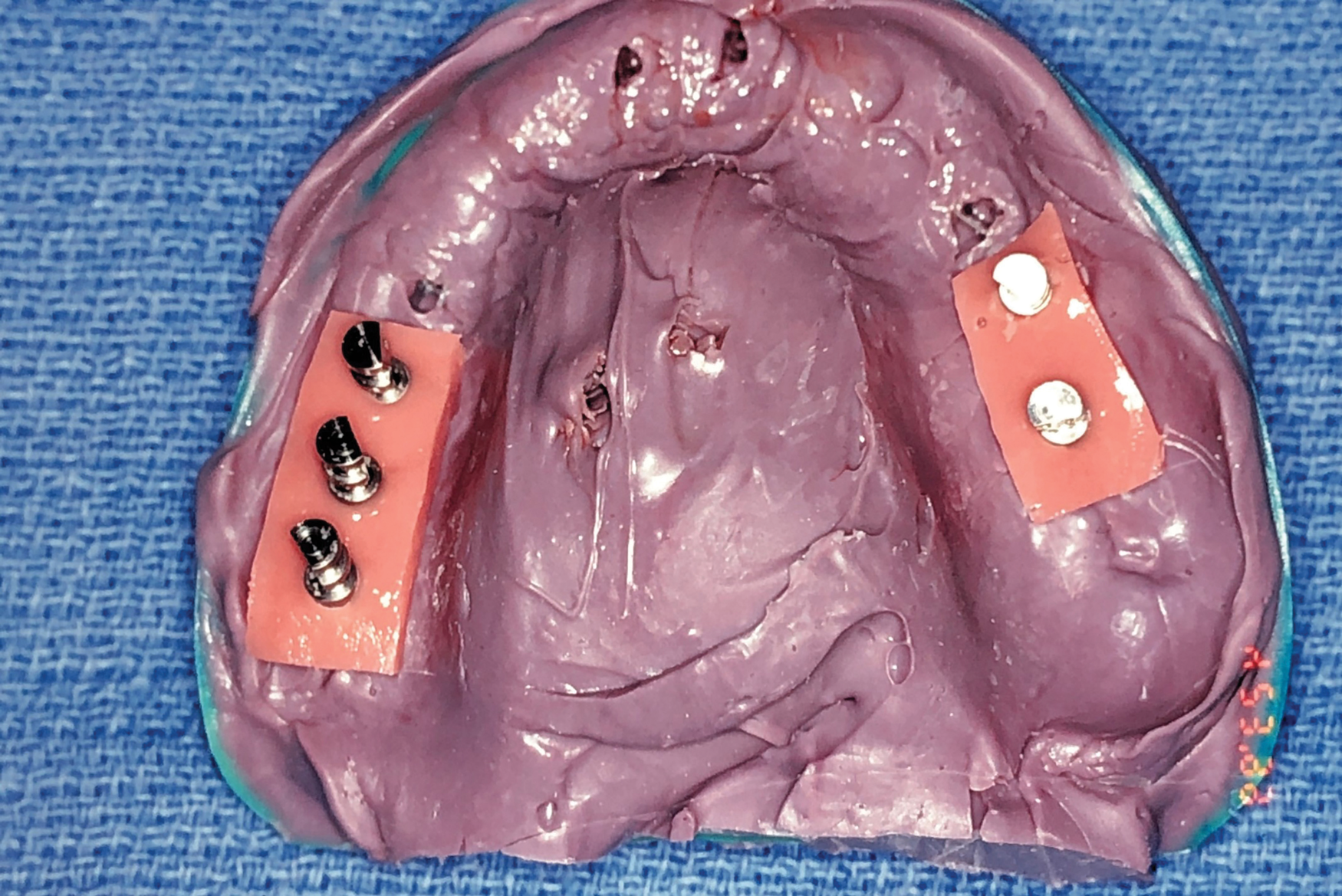 Gingival protective plastic spacers were placed over the squared TI heads to prevent flowing acrylic or composite from interlocking into the wider implant heads (onto the assembly). A titanium connective bar was inserted through the TI grooves facing upward, passing palatally to remaining tooth No. 6, through the palatal cusp of tooth No. 11 and through the central fossa of tooth No. 16, and aligned to follow the contour of the edentulous ridge (Figure 4). Modular copings were placed over the TIs/TI bar in a clamp-like approach, engaging the gingival protective spacers (Figure 5).