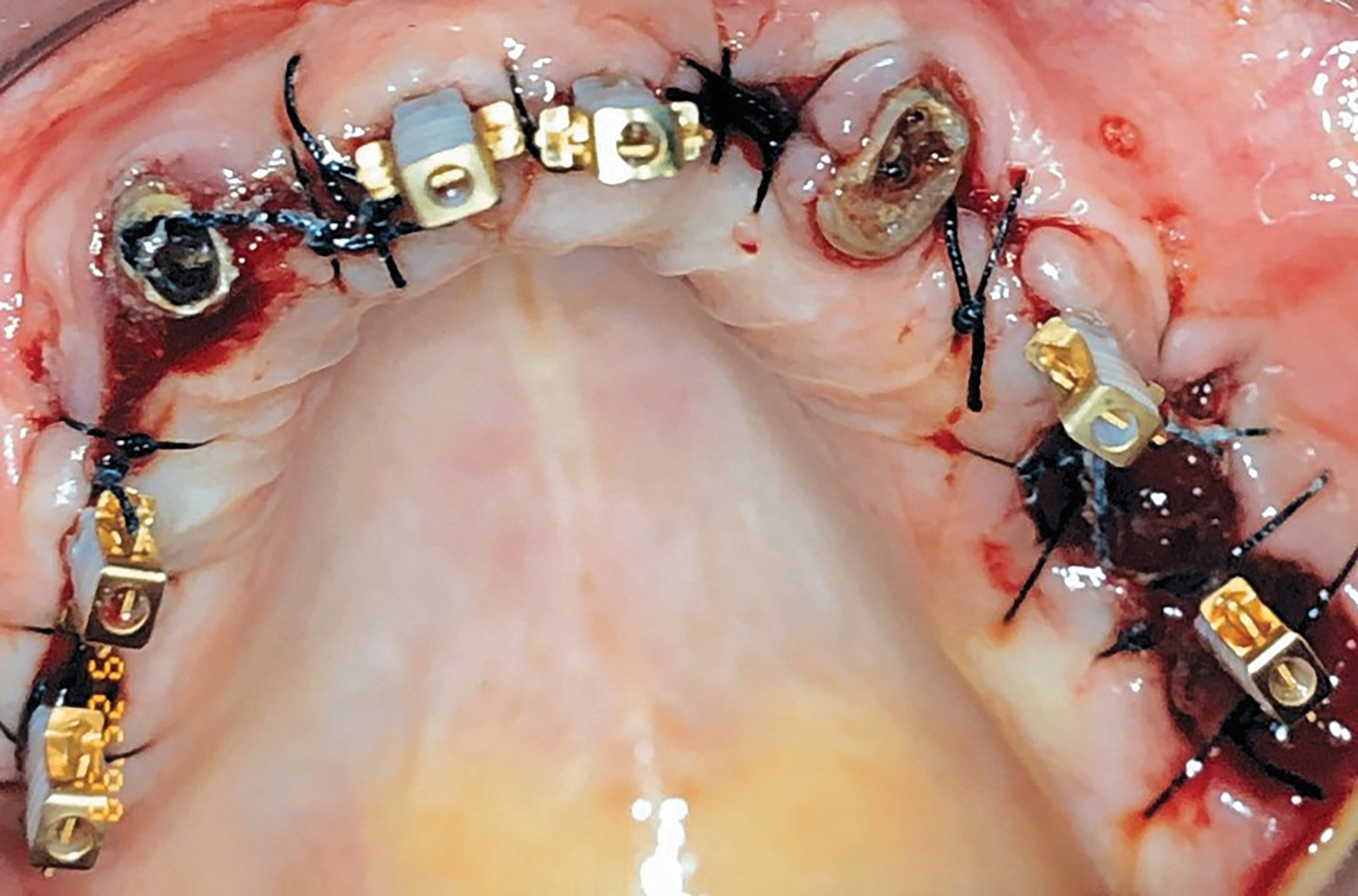 Teeth Nos. 10, 14, and 15 were extracted after achieving local anesthesia (2% lidocaine with 1:100,000 epinephrine, Henry Schein Dental). Teeth Nos. 6, 11, and 16 were retained as temporary abutments for the provisional. A midcrestal incision was made with a 15C blade, and a full-thickness flap was reflected with a periosteal elevator. Osteotomies were created with a 1.3-mm pilot drill at sites Nos. 3, 5, 8, 9, 12, and 14 using a surgical stent. Six TIs (Dentatus MTI™, Dentatus) were placed using a right-angle handpiece driver and then tightened manually with the winged socket key (Figure 3).