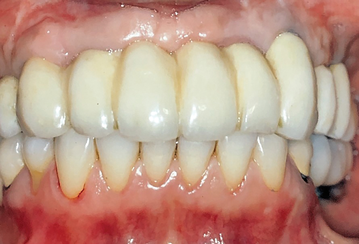 Follow-up appointments were scheduled at 1 week, 2 weeks, 4 weeks, 6 months, and 1 year post insertion. Radiographs and clinical examinations showed peri-implant soft tissue and marginal bone levels, and the prostheses were stable (Figure 16). Oral hygiene instructions were reinforced, and maintenance was scheduled every 3 to 6 months. At the 5-year follow-up visit, the patient exhibited excellent peri-implant soft-tissue health, stable marginal bone levels, and good stability of prostheses (Figure 17).