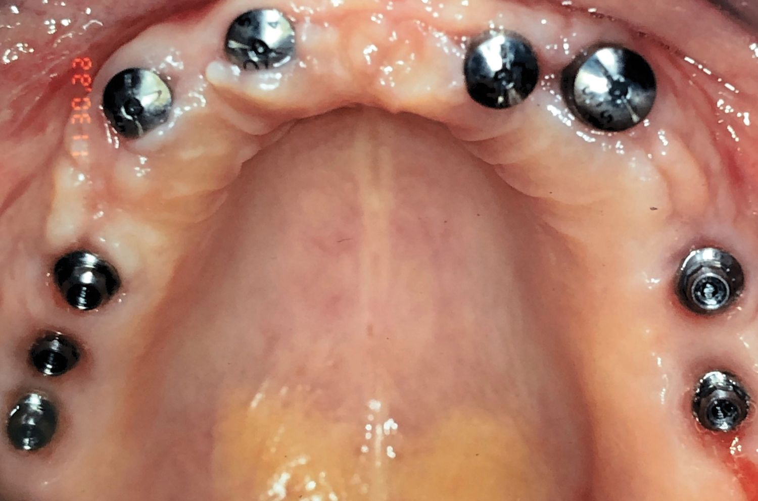 Three weeks later (Figure 8), an impression was taken (Figure 9) for a laboratory-processed, screw-retained, implant-supported provisional prosthesis. Six months later, the TIs on sites Nos. 5, 8, 9, and 12 were removed, and two implants (Biomet 3i, 3.25 mm x 13 mm) were placed in sites Nos. 8 and 10 using a surgical guide. Cover screws were then placed (Figure 10). The fixed laboratory-fabricated provisional prosthesis was screwed in on implants Nos. 2, 3, 4, 13, and 14 (Figure 11). After 4 months, the patient presented with uneventful healing, and second-stage surgery was performed on implants Nos. 6, 8, 10, and 11 (Figure 12).