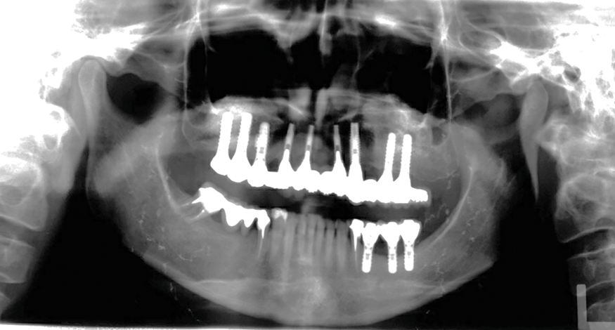 Postoperative instructions were given to the patient, and the same medications as previously described were prescribed again. A panoramic radiograph was taken (Figure 7). The provisional prosthesis was adjusted and recemented. The healing process was uneventful, with no infection, inflammation, or pain.