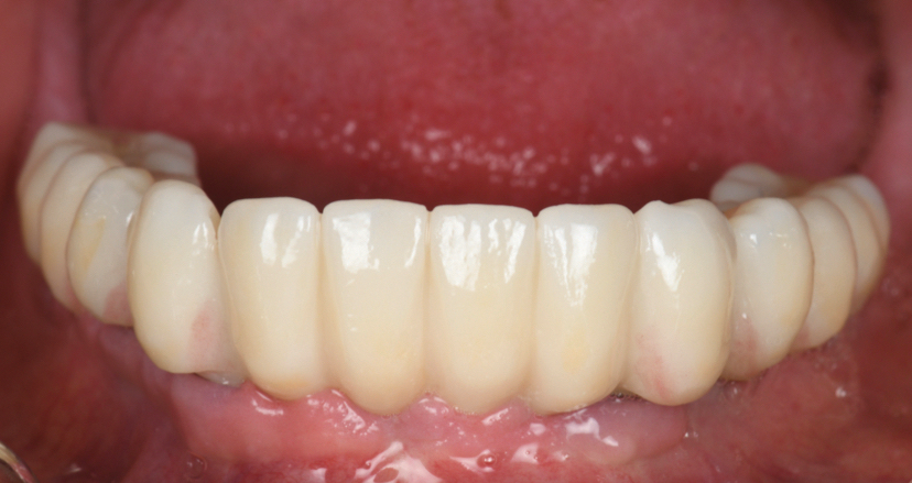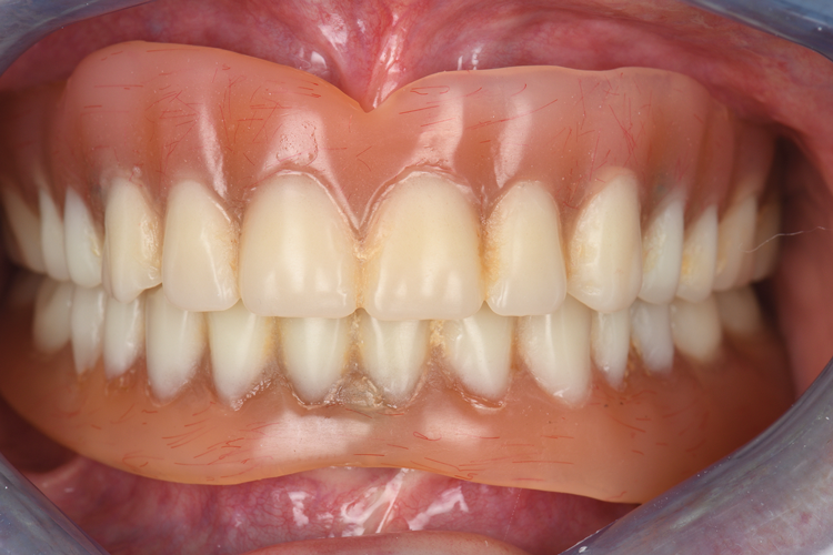 The next day pink porcelain was used to establish the pink esthetic in the maxilla, and stain and glaze was used to finish the overall esthetic for both the maxilla and mandible. Using pink ceramic or so-called liquid ceramics is still necessary to establish the pink esthetic, as the performance of just stain and glaze for current material does not adequately mask the high-value zirconia to provide a deep gingival esthetic.17