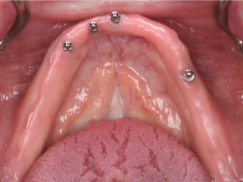 For the mandibular arch treatment, six implants were placed at the first molar, first premolar, and canine sites, and guided bone regeneration (GBR) was completed for the anterior implants at the time of placement. Primary closure was obtained. The patient continued to wear her existing restoration during healing. The presence of the mini implants to support the existing restoration prevented pressure from occurring on the GBR area to enable proper healing. After adequate healing time of 4 months, the implants were exposed, multi-unit abutments were placed, and provisional PMMA was picked up; positioning was aided by the mini implants based on the original restorative set-up that was printed. After temporary cylinders were picked up, the existing mini implants were removed by reverse torquing (Figure 11).